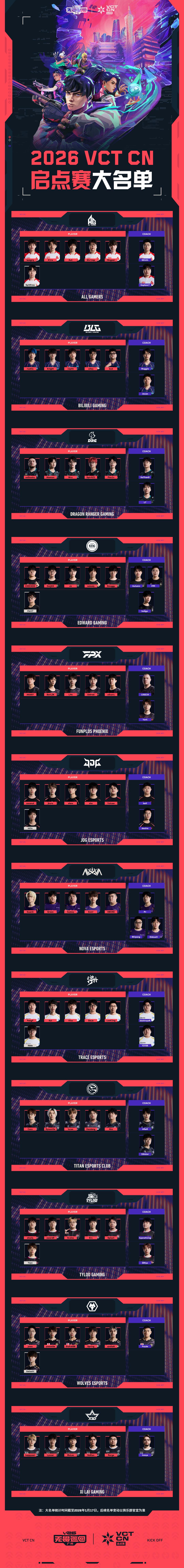 虎扑01月17日讯2026VCTCN启点赛将于1月22日-2月9日正式打响,十二支参赛队伍现已集结完毕。无畏契约电竞官方公布2026VCTCN启点赛队伍大名单。