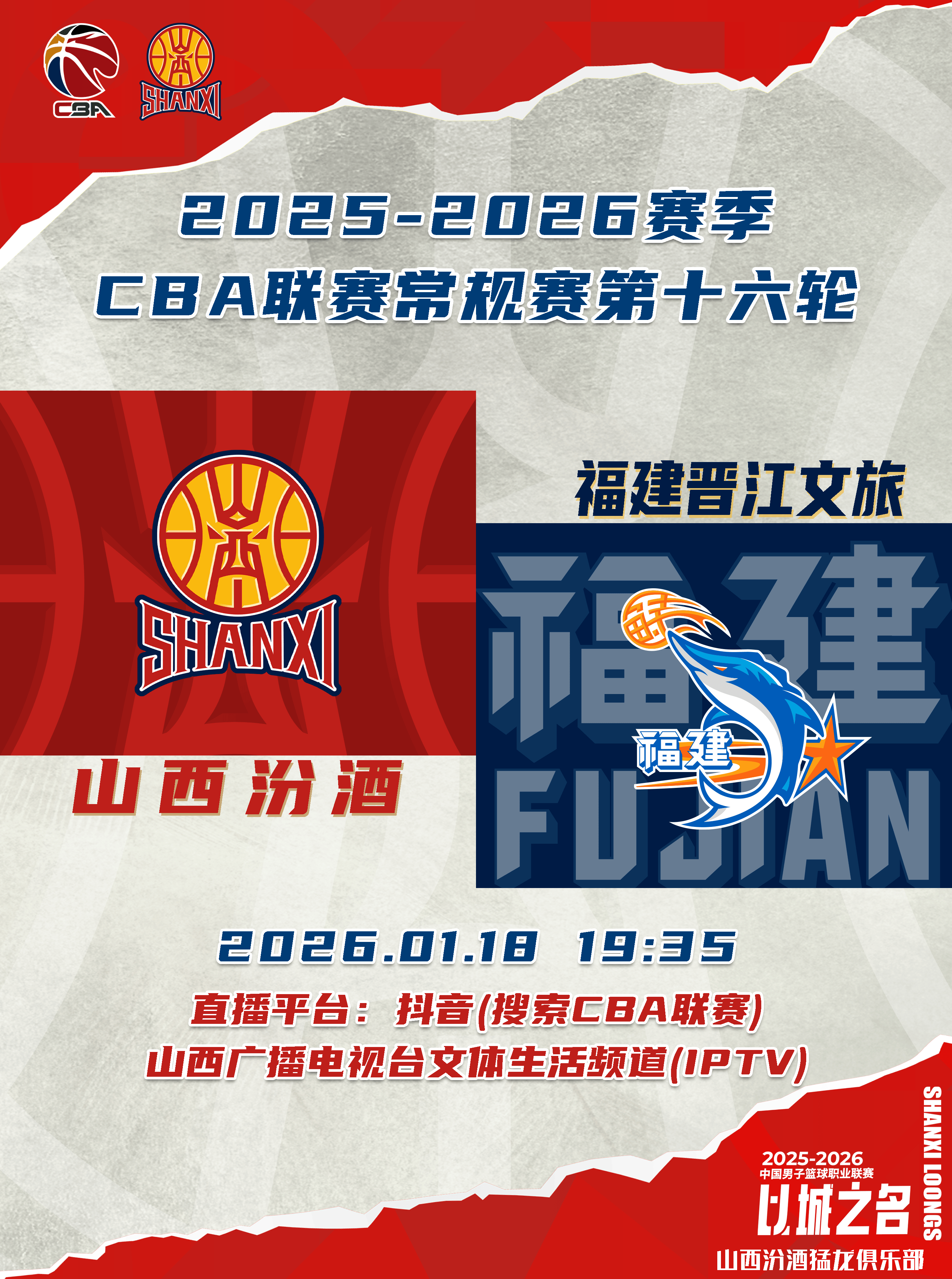 赛前据山西男篮发文,北京时间2026年1月18日19:35,2025-2026赛季CBA联赛常规赛第16轮继续进行,山西汾酒回归主场迎战福建晋江文旅。