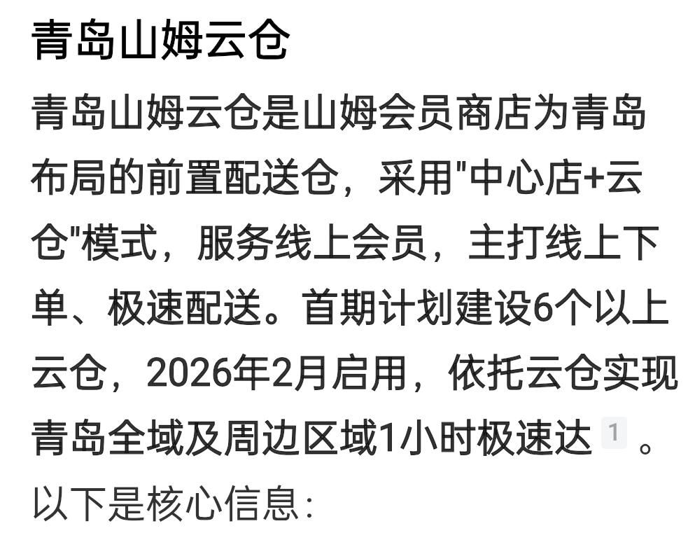青岛山姆6个云仓于26年2月份开通,所以,现办理会籍卡不用等到5月开业,可线上购物1小时青岛全城极速达送货到家,