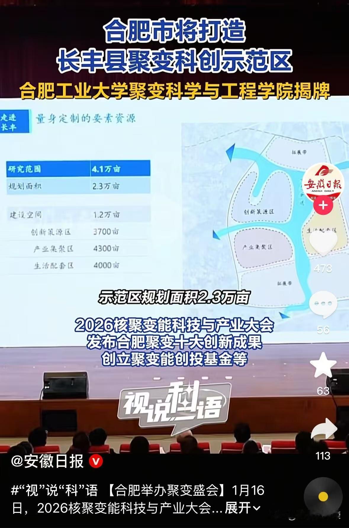 合肥市聚变科创示范区,概念规划发布! 作为科技城市,合肥市又一大布局,聚变科创示范区即将进行建设,在大科学装置示范区之后又一个科技产业布局。 示范区落户于长丰县,陶楼镇。下塘西部。规划2.3万亩土地,长丰又一个发展增长点。 合肥科创新地标 合肥科创 合肥规划