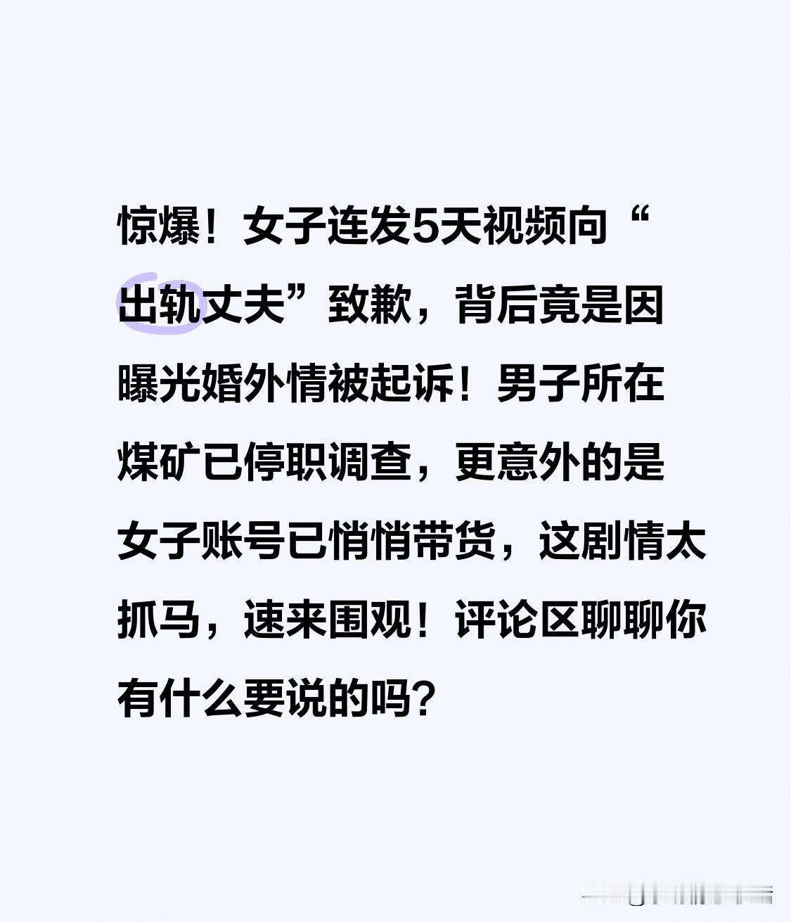 惊爆!女子连发5天视频向“出轨丈夫”致歉,背后竟是因曝光婚外情被起诉! 简要:自1月12日起,河南三门峡女子牛某某在社交平台发布向出轨丈夫“道歉”的视频。 男子所在煤矿已停职调查,更意外的是女子账号已悄悄带货,这剧情太抓马,速来围观!评论区聊聊你有什么要说的吗?出轨 剖析出轨行为