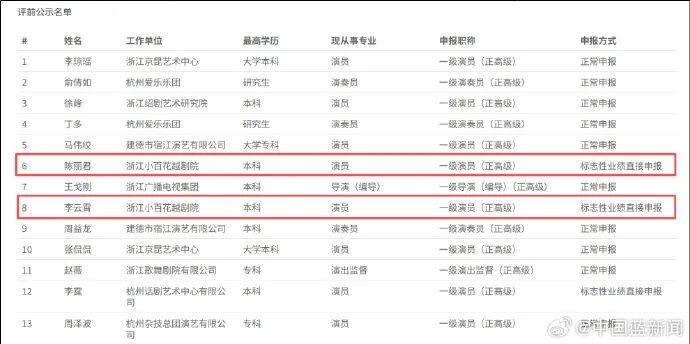 近日,据浙江省专业技术职务任职资格申报与评审管理服务平台,浙江小百花越剧院演员陈丽君和李云霄以标志性业绩直接申报一级演员,现已进入公示期。