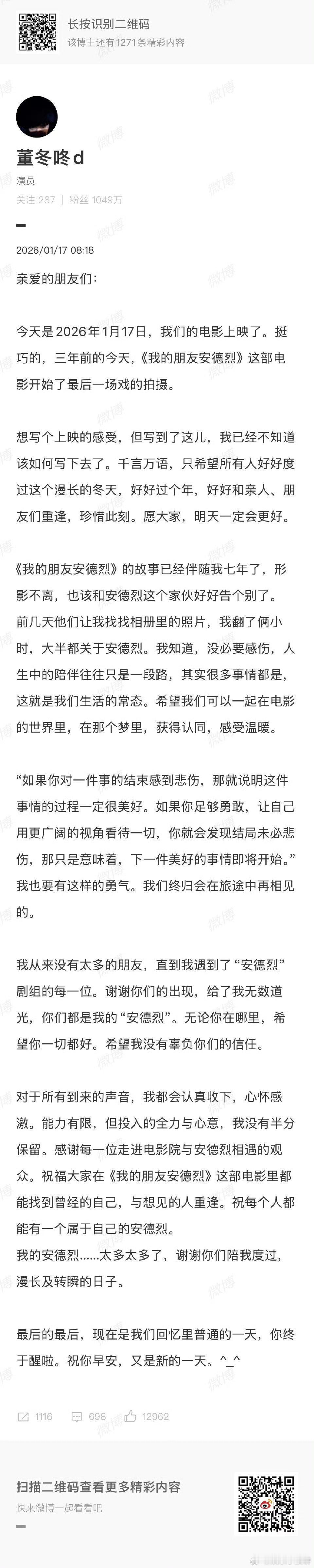 董子健写给安德烈的信 七年相伴,落笔成信!董子健写给安德烈的文字细腻又有力量,把拍电影时的感悟、对友情的理解娓娓道来,满是真诚与感动!
