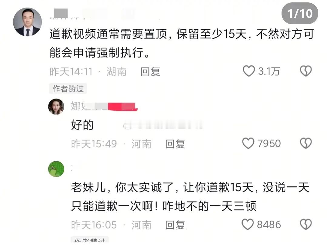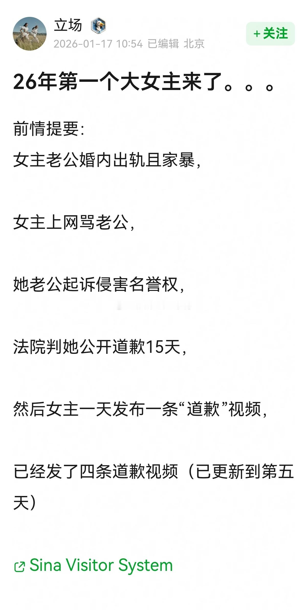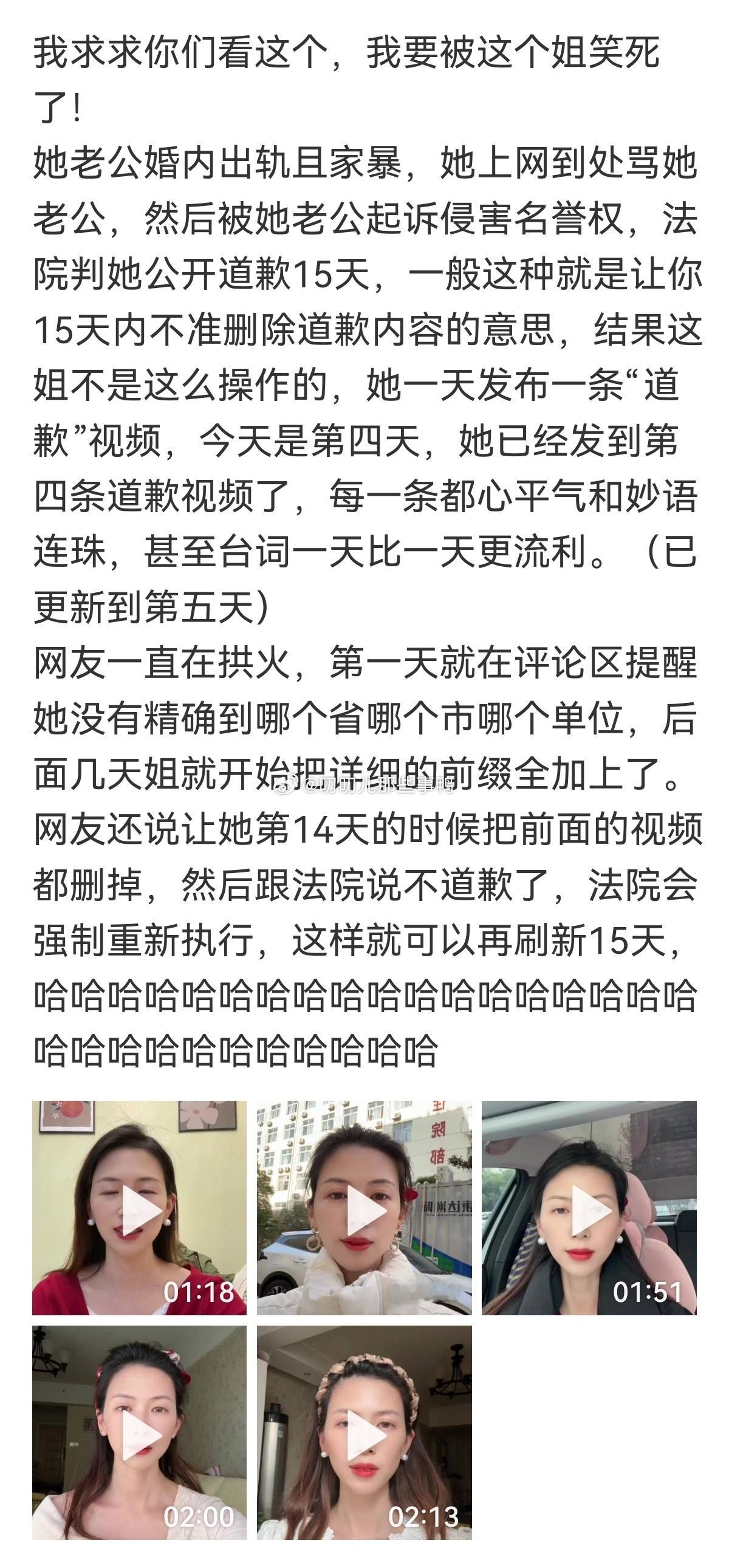 女主老公婚内出轨且家暴,女主上网骂老公,她老公起诉侵害名誉权,法院判她公开道歉15天,然后女主一天发布一条“道歉”视频,已经发了四条道歉视频(已更新到第五天)
