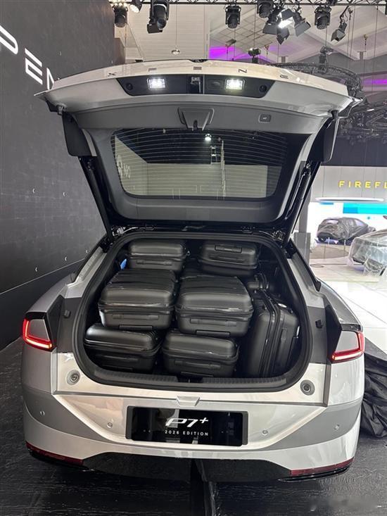 新款小鹏P7+在比利时布鲁塞尔车展中向欧洲媒体展示了不影响前排驾乘情况下可装载3