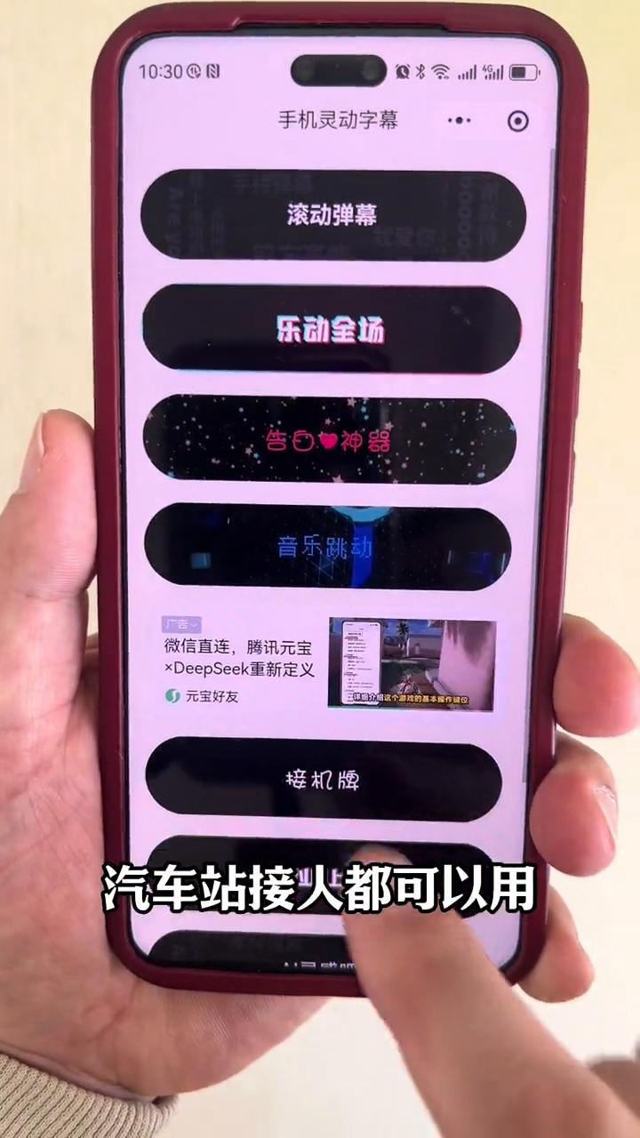 像这种手机灵动字幕是如何做出来的呢? 像这样的手机灵动字幕大家知道是怎么做出来的吗?方法其实非常简单,很多朋友还不知道怎么做的,我们不用花钱也不用下载什么软件,简单三步就能学会。 这种灵动字幕的应用非常广泛,就比如跟你的女神告白,几个人围在一起一起拿着这样的灵动字幕,你的女神是不是非常开心?或者你在机场接人可以用它,酒吧、演唱会、ktv等等都能用得上。当然了,过年还可以把这种祝福语打在屏幕上献给别人,非常好用。 接下来我就用手里这部手机给大家做个演示,怕记不住的保存好视频,有时间了多看两遍。 ·把自己手机的微信打开,随便找一个跟朋友的对话框就行了。 ·然后输入框这里长按一秒,看到这个搜一搜了吗?点它。 ·点开之后上方输入框输入灵动字幕四个字,点搜索,出来的第一个就可以点进去了。 ·进来之后先不要去动,让它自动跳过就可以。这里面功能都一样用的,只教一种就行了。 ·进来之后先把这个叉号关掉,这上方就有很多的像这种乐动,全场你看酒吧、ktv都可以用它。 ·然后这里告白神器,跟你的女神告白、跟小姐姐表白等等都可以用它。音乐跳动,像这种演唱会等等都可以去用的。下方是机场接人、汽车站接人都可以用。 ·使用方法都一样,比如说跟你的女神告白,那么你就选择这个告白神器,点进来之后把这个叉号关掉。 ·上方的文字怎么改的?点一下屏幕下方这里就可以修改了。注意,点这个发送来大家看一下,自动的出来你所想要说的话了。 ·怎么修改它的颜色?看到这里有一个功能键了吗?点开它之后,这里面字体的颜色、字体是什么样子的以及播放的速度,还有这种字号,还有背景颜色都可以去换的。大家看这个效果,自己喜欢什么颜色都行,还有这种动态背景都是可以的,可以完全试一下,喜欢哪种用哪种。 其他的使用方法也都一样,点击右上角还可以发送给你的朋友。看到这里了吗?也可以添加到桌面,以后在桌面打开就能用,是不是非常好办?