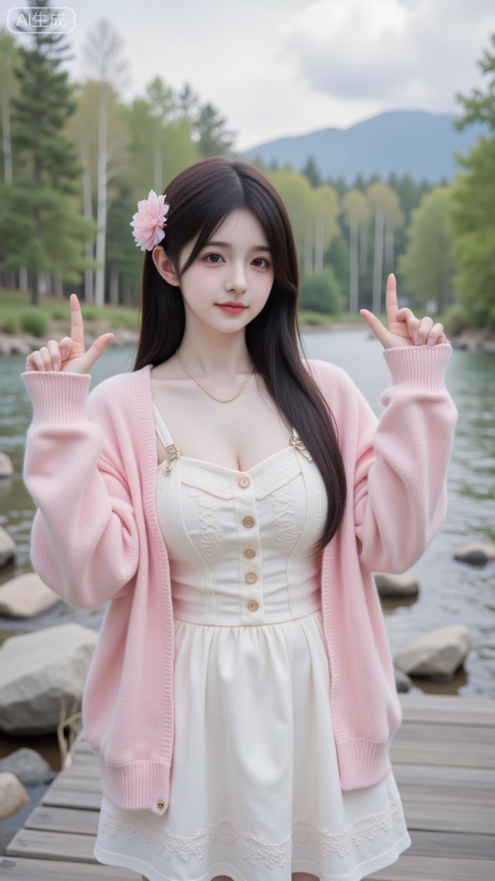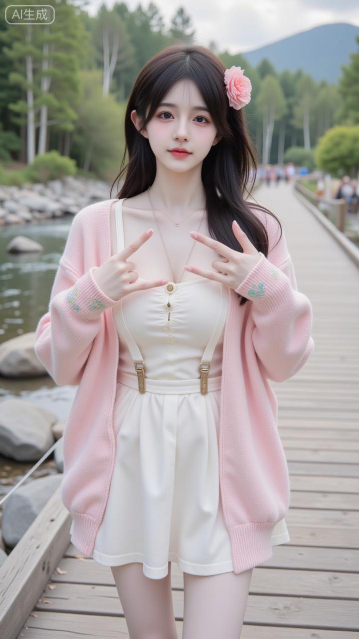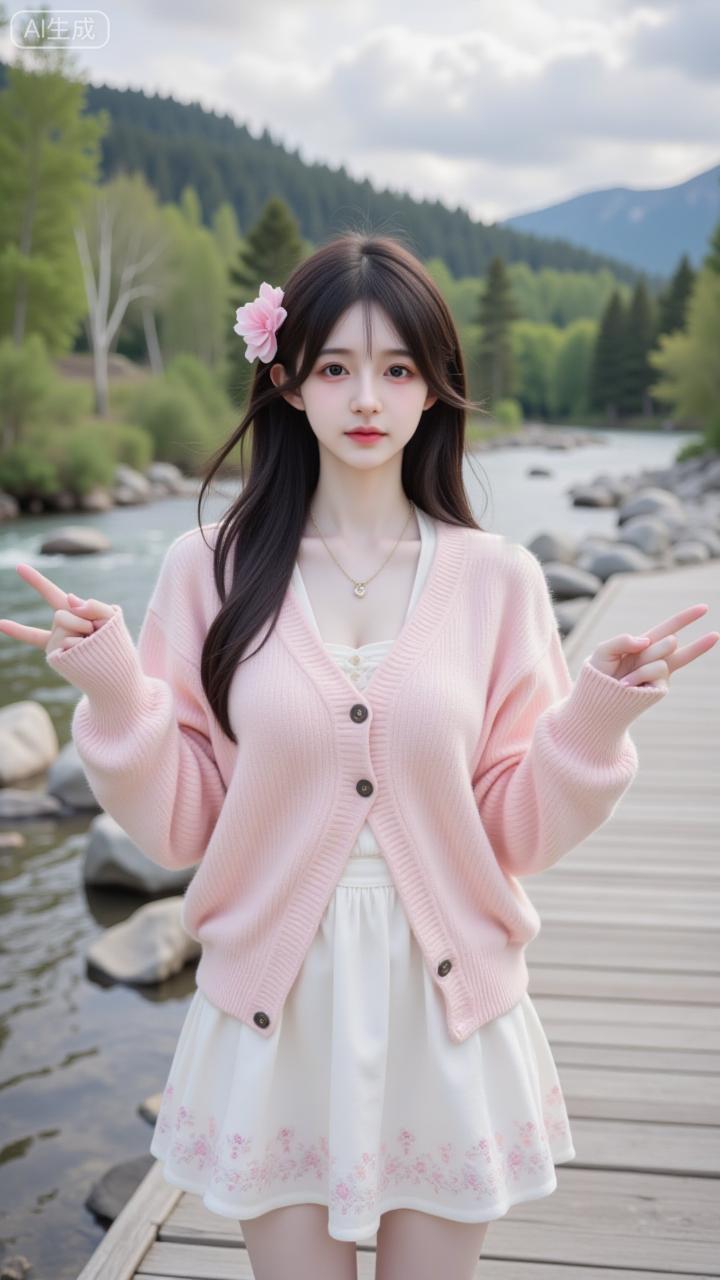 河畔的软甜系少女 粉毛衣裹着温柔感,白裙的碎花细节戳中少女心~发间小花和远山溪流配在一起,连风都成了她的松弛滤镜✨ 是把“自然氛围感”焊在身上的妹妹!暖红毛衣少女 少女系毛衣