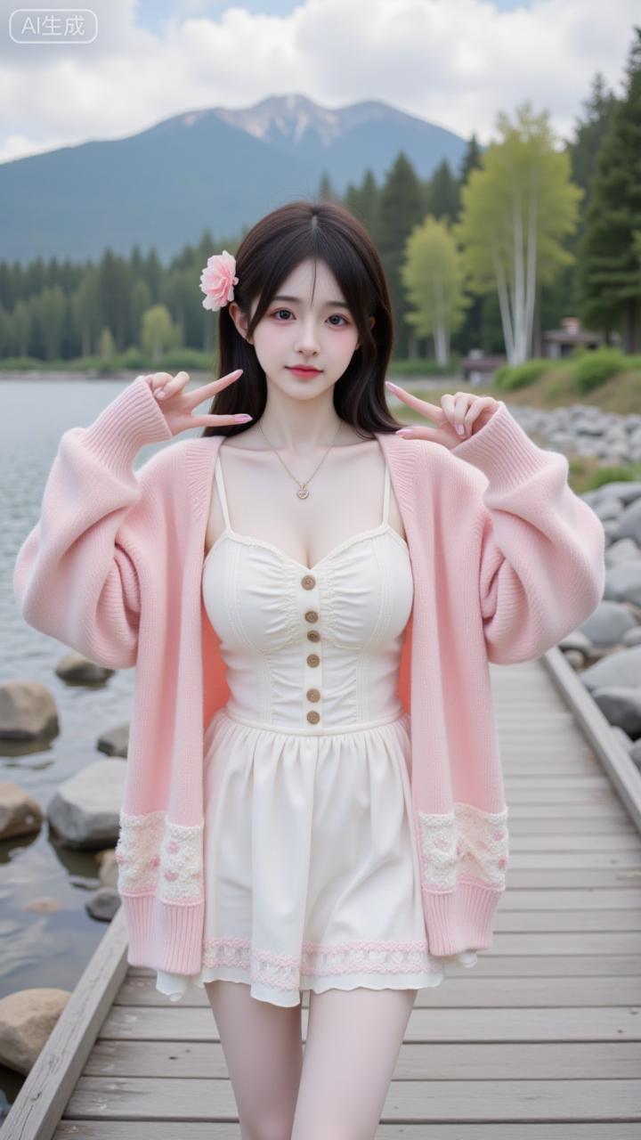 河畔的软甜系少女 粉毛衣裹着温柔感,白裙的碎花细节戳中少女心~发间小花和远山