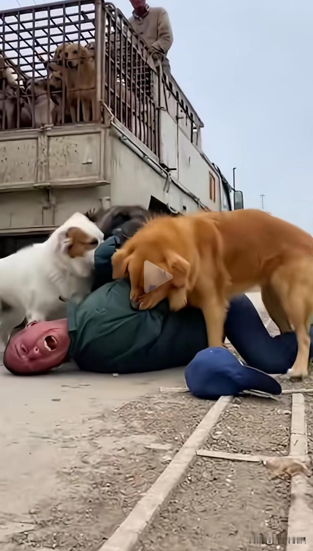 狗贩子拉着满满一车狗狗前往屠宰场,途经某路段时,瞧见一只流浪狗,便想把它套住,一同弄上狗肉车。当流浪狗被套住拖上车的瞬间,它的一只同伴狗狗紧紧抱住它。两只狗狗的重量让狗贩子力不从心,竟被它们一同拉翻下了车。复仇的狗狗疯狂撕咬狗贩子,还有几只同伴也赶来相助,直咬得狗贩子大喊救命,叫苦不迭。抓狗贩子 贩狗车