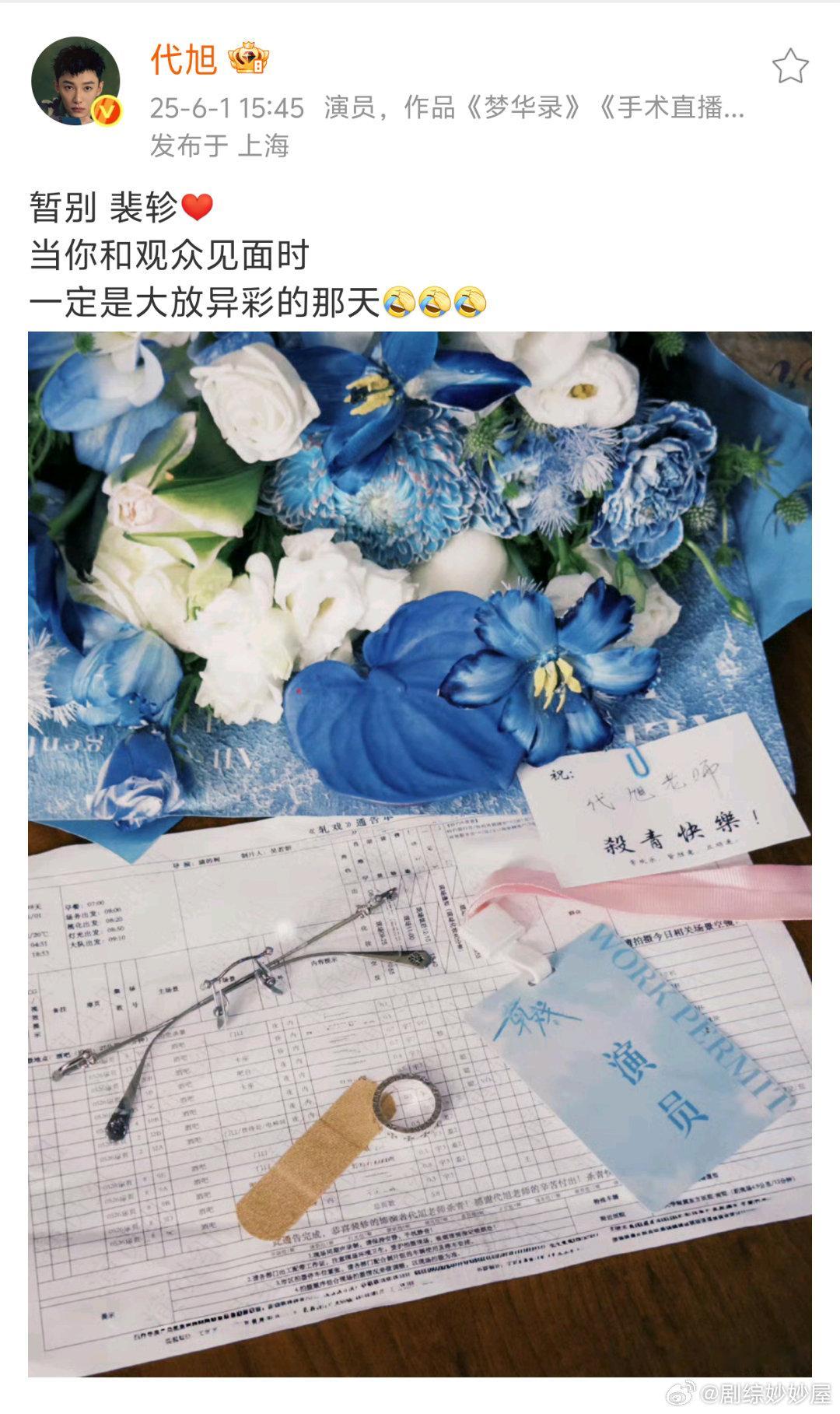 代旭《轧戏》杀青博里的配图是裴轸三要素:眼镜、戒指、创可贴🥹常推的眼镜👓常戴