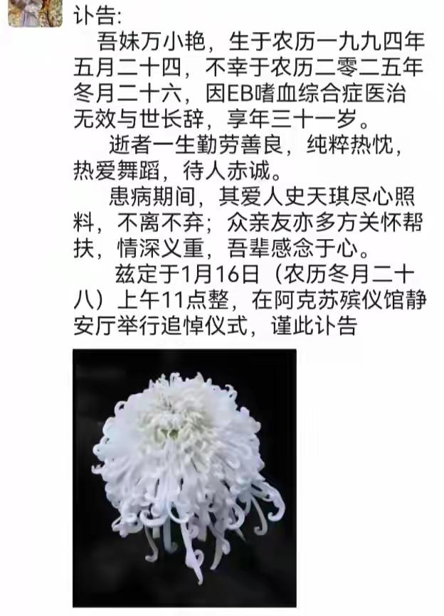 新疆31岁舞蹈老师患病不幸离世,从确诊到离世仅两个多月;其丈夫卖房卖车倾尽所有仍未留住爱人 1月14日,31岁新疆舞蹈老师万小艳因患EB噬血细胞综合征不幸离世,从确诊到生命终结仅两个多月。为救治妻子,其丈夫毅然卖房卖车倾尽所有,但仍未留住爱人,坦言“不后悔”。 这是一段令人心碎又令人动容的故事,也是一面折射出社会现实的镜子。在这个快节奏的时代,生命的脆弱和爱情的坚韧交织在一起,撼动着每一个人的心。 万小艳,一个年轻的舞蹈老师,用她的热情点亮了无数学生的梦想。她的舞蹈,不仅仅是艺术的表达,更是一份温暖与希望。然而,命运似乎开了个残酷的玩笑。短短两个多月,从确诊到离世,这个美丽的生命就如此匆匆告别了这个世界。那一幕幕,令人心碎:她的丈夫卖掉了家里的房子和车子,倾尽所有只为挽留那一抹微笑,却终究未能逆转命运的安排。 或许有人会问:付出了这么多,值得吗?答案很简单——值得。因为在爱情的世界里,没有“值得”与“不值得”的界限。那是一份信仰,是一种坚守。万小艳的丈夫说:“不后悔。”这句话,仿佛在告诉我们:爱,是无畏的勇气,是在绝望中依然选择相信的力量。 但我们也不得不反思:这样的悲剧,究竟暴露了什么?医疗资源的匮乏?疾病的无情?还是社会对普通家庭的支持不足?每一个像万小艳一样的年轻生命,都值得拥有更好的医疗保障,更温暖的社会关怀。而我们,作为旁观者,是不是也该多一些关注和行动? 这个故事让我们看到了人性中最纯粹的那一面——爱与奉献。它也提醒我们,生命的脆弱和珍贵,不能被忽视。我们不能保证每个人都能像万小艳一样幸运,但我们可以用行动去守护那些需要帮助的人。 也许,很多人都在问:生命为什么如此脆弱?答案或许在于,我们都在用生命书写着自己的故事。每一个平凡的日子,都是生命的礼赞。愿我们都能在自己的岗位上,发光发热,为那些需要帮助的人带去一丝温暖。愿像万小艳一样的生命,能在我们的社会中,得到更多的关爱与守护。 让我们记住这个故事,也希望每个人都能在平凡中找到不平凡的意义。因为,爱,从未远离。