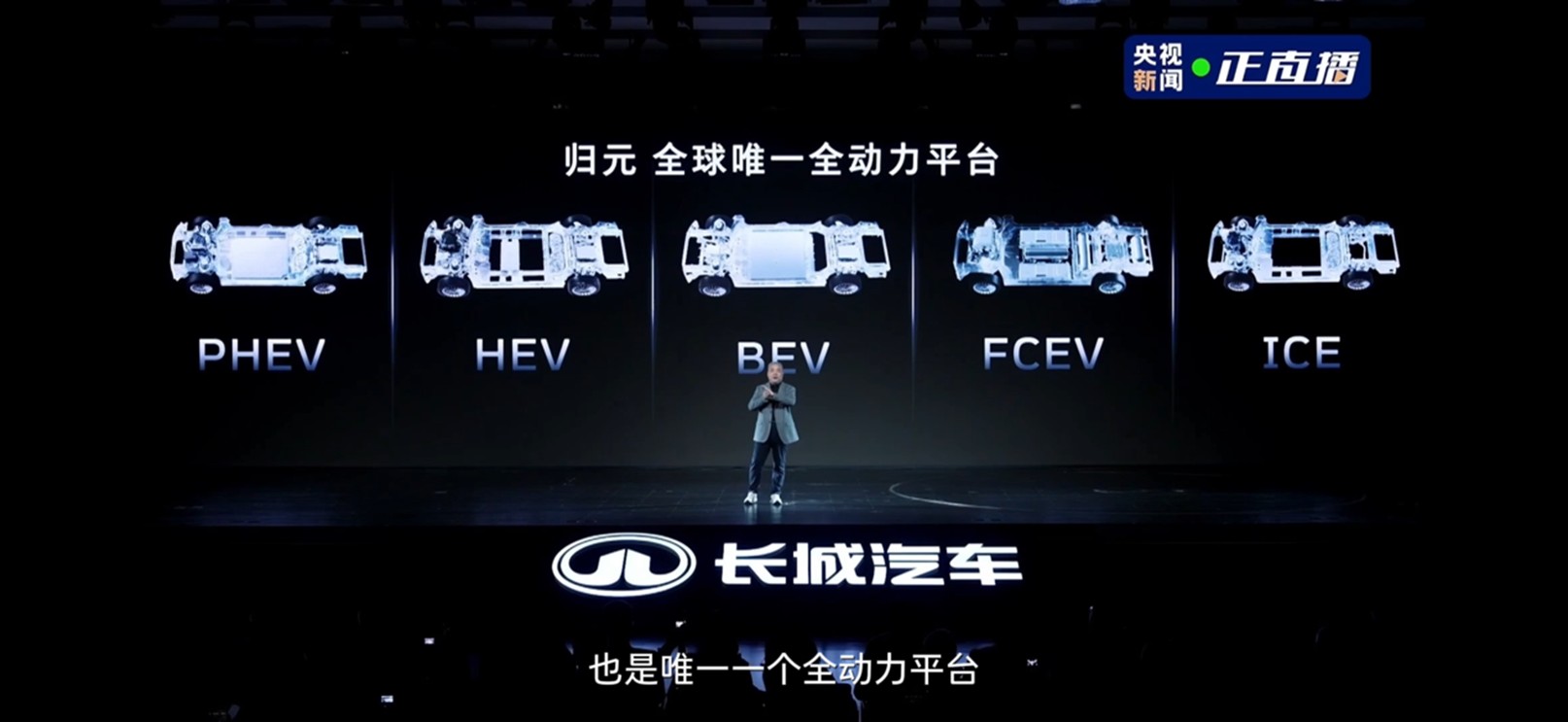 1月16日,长城汽车正式推出全新技术平台“归元”。作为全球首个原生AI全动力汽车平台,其核心突破在于实现插电混动(PHEV)、混动(HEV)、纯电(BEV)、氢燃料(FCEV)和传统燃油(ICE)五大动力形式的原生兼容。