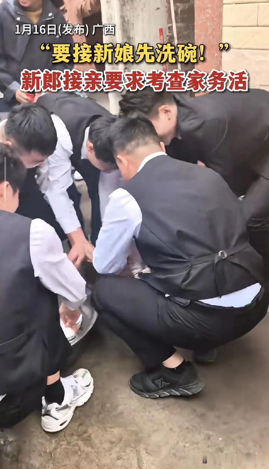 现在娶老婆太可怕了! 新郎伴郎蹲地上洗碗,这婚结得太“接地气”了 广西一场婚礼直接把我看傻了!别人接亲是堵门要红包,这家人倒好,直接摆上两大盆碗,喊着“要接新娘先洗碗”。 西装革履的新郎和伴郎们,瞬间化身“洗碗天团”,蹲在地上搓碗的样子又好笑又心酸。伴郎们一边洗一边吐槽,“早知道带个洗碗机来了”,围观的亲戚笑得直不起腰。 这哪是接亲,明明是新娘家的“婚前摸底考试”——考验你愿不愿放下身段,婚后能不能分担家务。比起花里胡哨的堵门游戏,这招更实在:能蹲下来洗碗的男人,婚后大概率不会甩手掌柜。 有人说这是“新型恶俗婚闹”,也有人夸“这才是婚姻该有的样子”。我倒觉得,比起天价彩礼,这种“接地气”的考验,反而让婚礼多了点烟火气