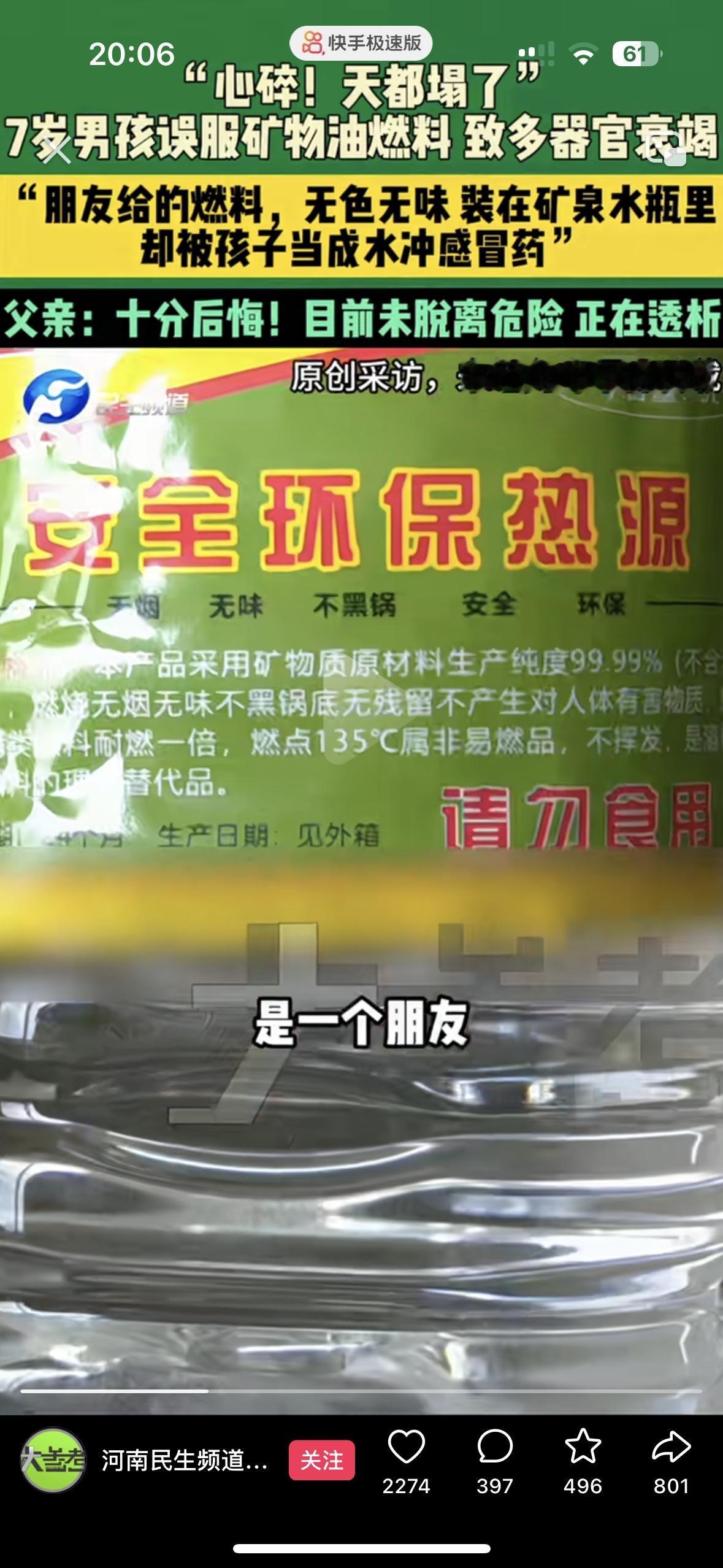 这是一次沉痛的教训!给所有的父母上了一课 7岁的男孩感冒了,爷爷拿了一瓶矿泉水兑了一点温水,给孙子冲了点感冒颗粒喝,孙子喝完后告诉爷爷水的味道不对,爷爷这才赶忙给轩轩爸爸打电话询问,才得知那是轩轩爸爸从朋友火锅店拿过来的无色矿物油燃料,准备在家吃火锅用,没想到被爷爷当成水给孩子喝了。 爸爸感觉天都塌了!吓得在外工作的轩轩爸爸赶忙回家带着儿子去当地医院检查,到医院不到一个小时,轩轩就开始呕吐随即昏迷,出现急性肝衰竭、肾衰竭。孩子现在还在尿血,爷爷的粗心搭上了可怜的孩子!如果孩子有个三长两短,让爸爸怎么活啊