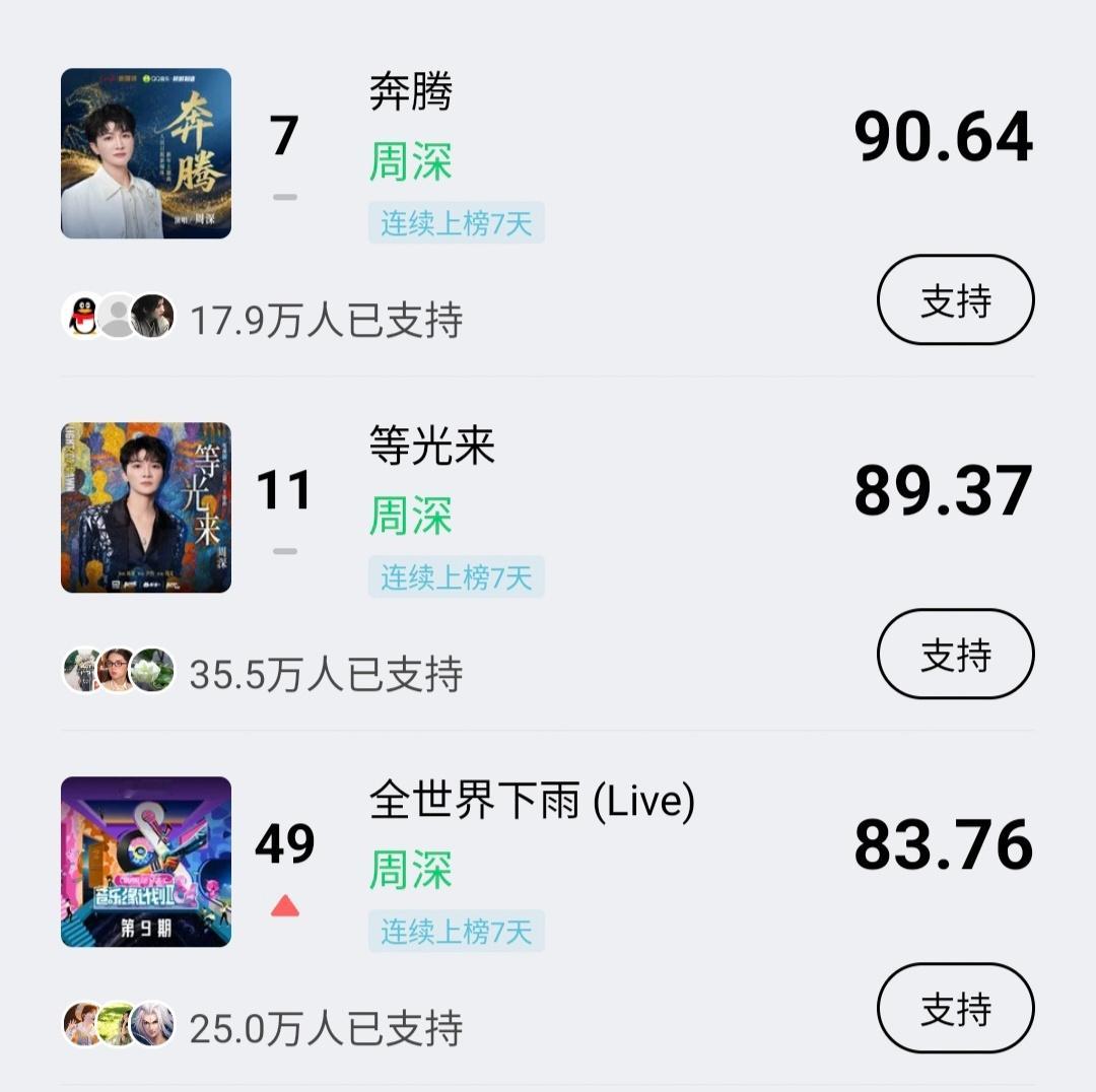 周深 📣 1.17 巅峰潮流 📣米米们晚上好,每歌做6个动作路径:Q音-乐馆-排行-潮流巅峰✅《奔腾》✅《等光来》✅《全世界下雨(live)》完成『支持』让更多人听到深深