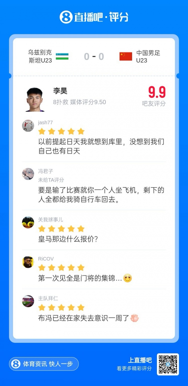 U23国足击败乌兹别克斯坦U23,晋级U23亚洲杯4强。本场超过2万名吧友给李昊打出了9.9分。