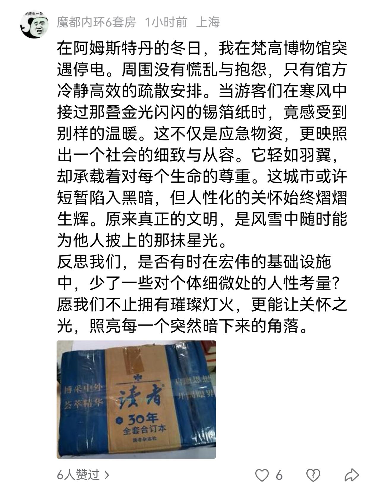 有博主分享了在荷兰阿姆斯特丹梵高博物馆的亲身经历:突遭全城停电,馆方无备用发电设备,于是清馆。因停电而无法拿到寄存柜里的衣物,不少人在阿姆斯特丹凛冽寒冬里瑟瑟发抖。唯一的防寒设备就是馆方提供的锡纸。 结果有位网友大才,他在评论区写下了: 在阿姆斯特丹的冬日,我在梵高博物馆突遇停电。周围没有慌乱与抱怨,只有馆方冷静高效的疏散安排。当游客们在寒风中接过那叠金光闪闪的锡箔纸时,竟感受到别样的温暖。这不仅是应急物资,更映照出一个社会的细致与从容。它轻如羽翼,却承载着对每个生命的尊重。这城市或许短暂陷入黑暗,但人性化的关怀始终熠熠生辉。原来真正的文明,是风雪中随时能为他人披上的那抹星光。反思我们,是否有时在宏伟的基础设施中,少了一些对个体细微处的人性考量?愿我们不止拥有璀璨灯火,更能让关怀之光,照亮每一个突然暗下来的角落。