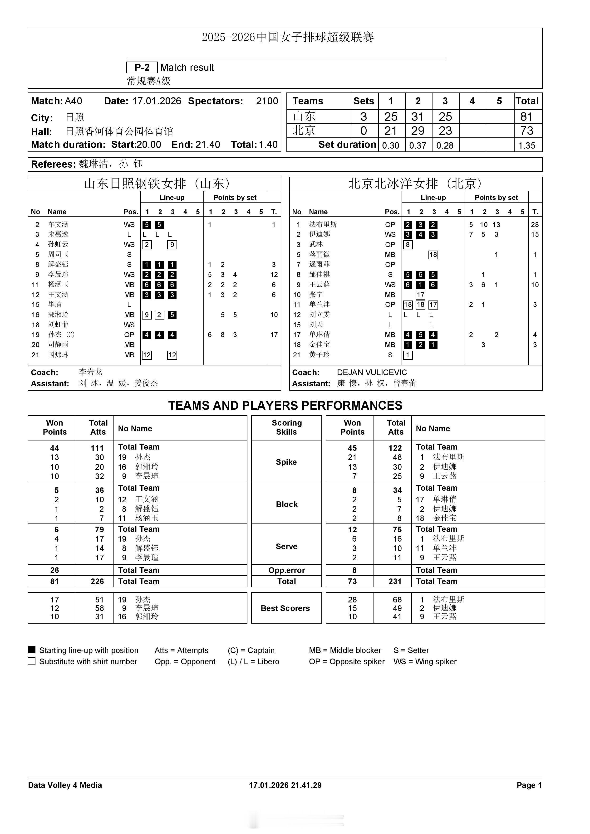 2025-2026中国女排超级联赛 A级常规赛第10轮 山东3-0北京 得分统计,法布里斯28分无力挽回败局,扣、拦、发全面占优,北京女排自失送26分。