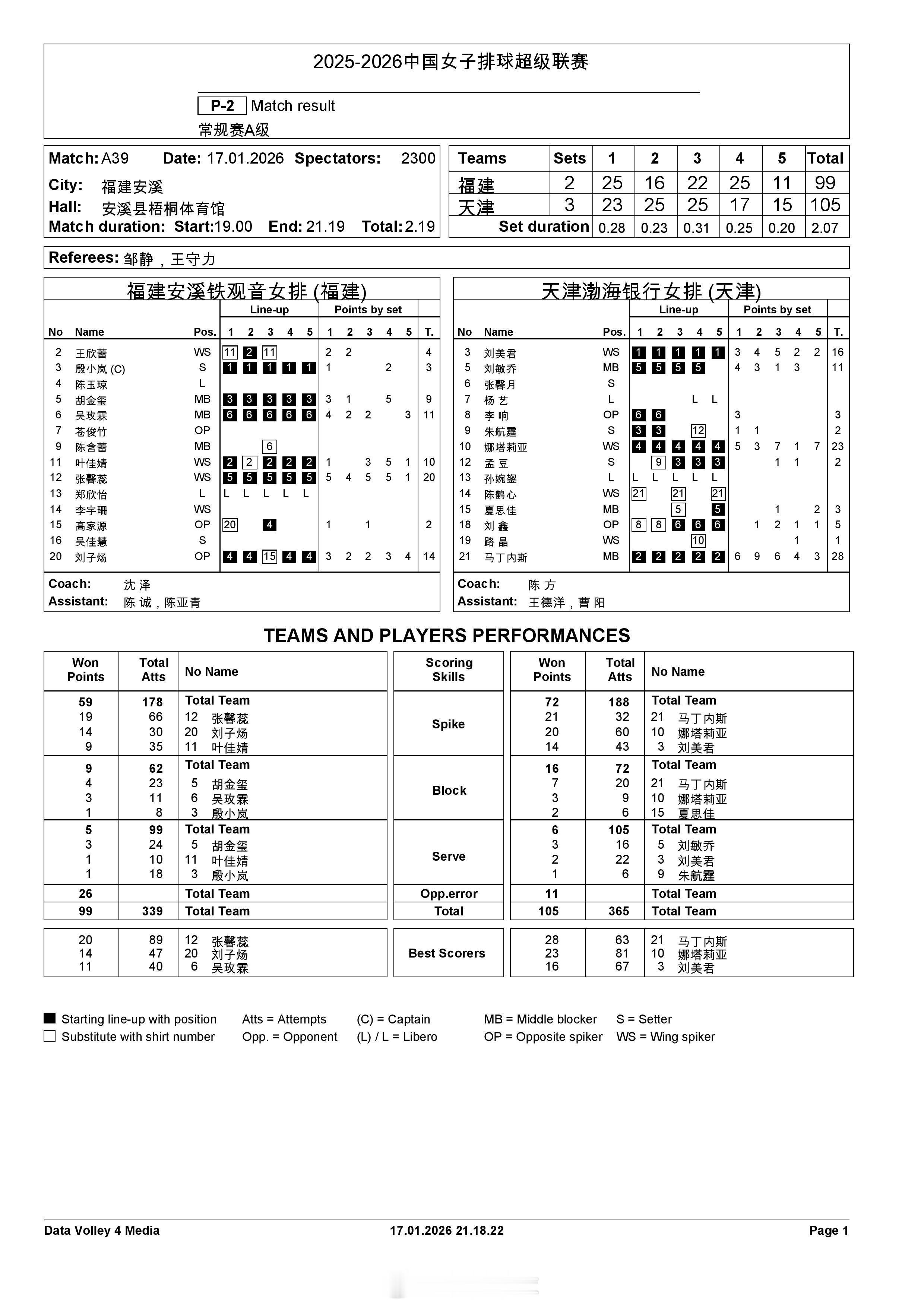 2025-2026中国女排超级联赛 A级常规赛第10轮 福建2-3天津 得分统计