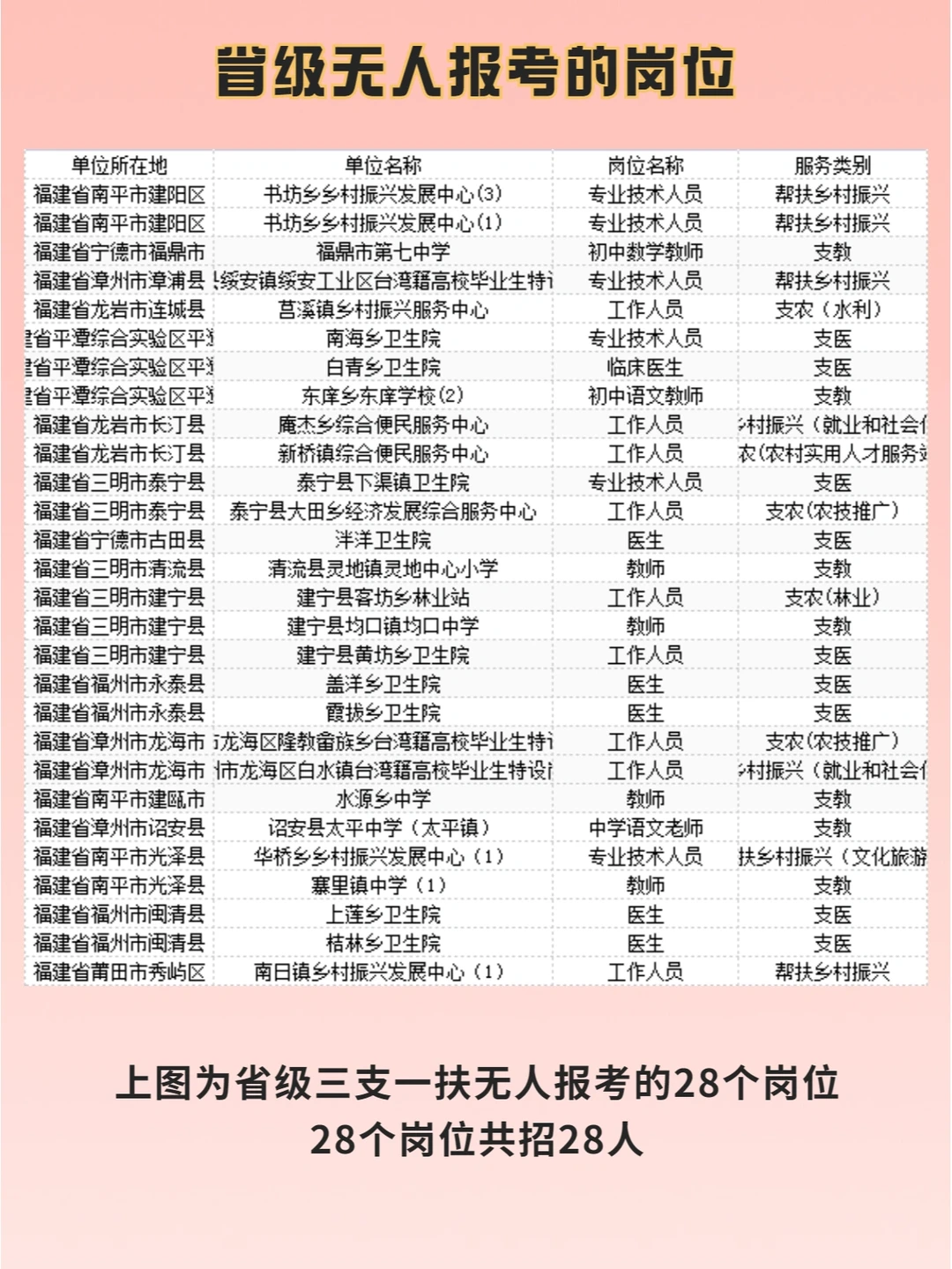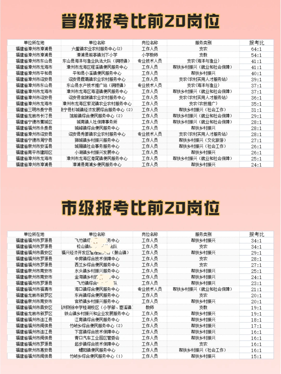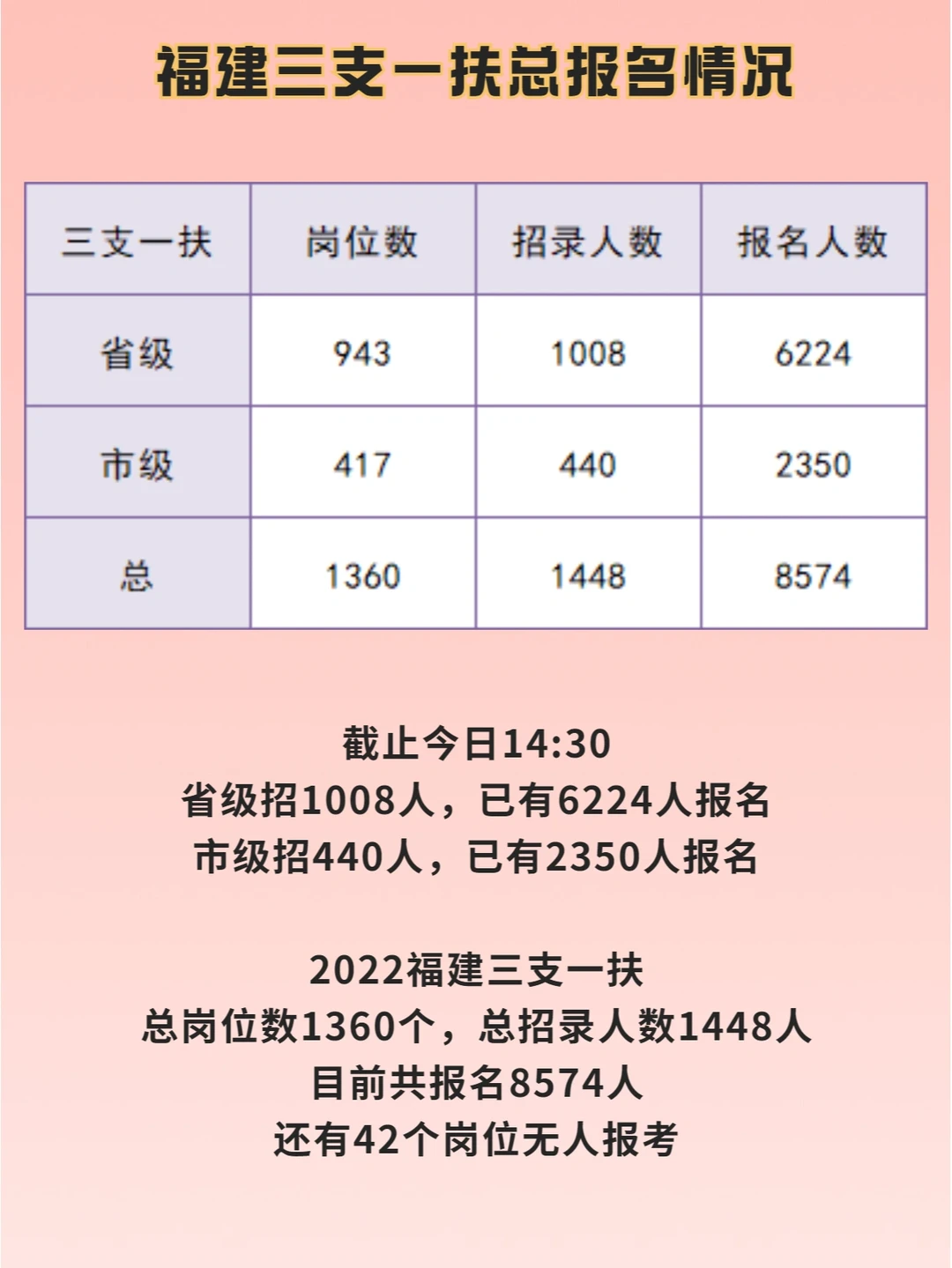 2022福建三支一扶报名情况: 🌈截止今日14:30 🌟省级招1008人,已有6224人报名,有28个岗位无人报考 🌟市级招440人,已有2350人报名,有14个岗位无人报考 - 🌸省级报考比最高的是漳州64:1,为漳浦县六鳌镇农业农村服务中心(2)的支农岗位,其次是三明31:1 🌸市级报考比最高的是福州34:1,有2个岗位,分别是罗源县飞竹镇综合便民服务中心的帮扶乡村振兴和罗源县松山镇综合。。队的支农岗位