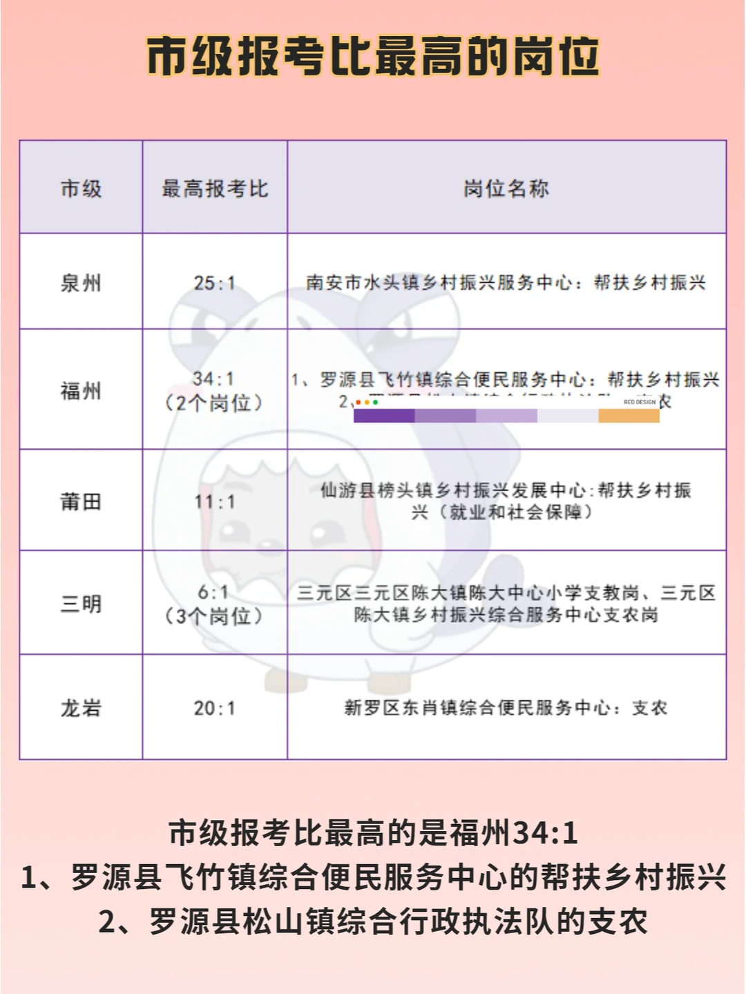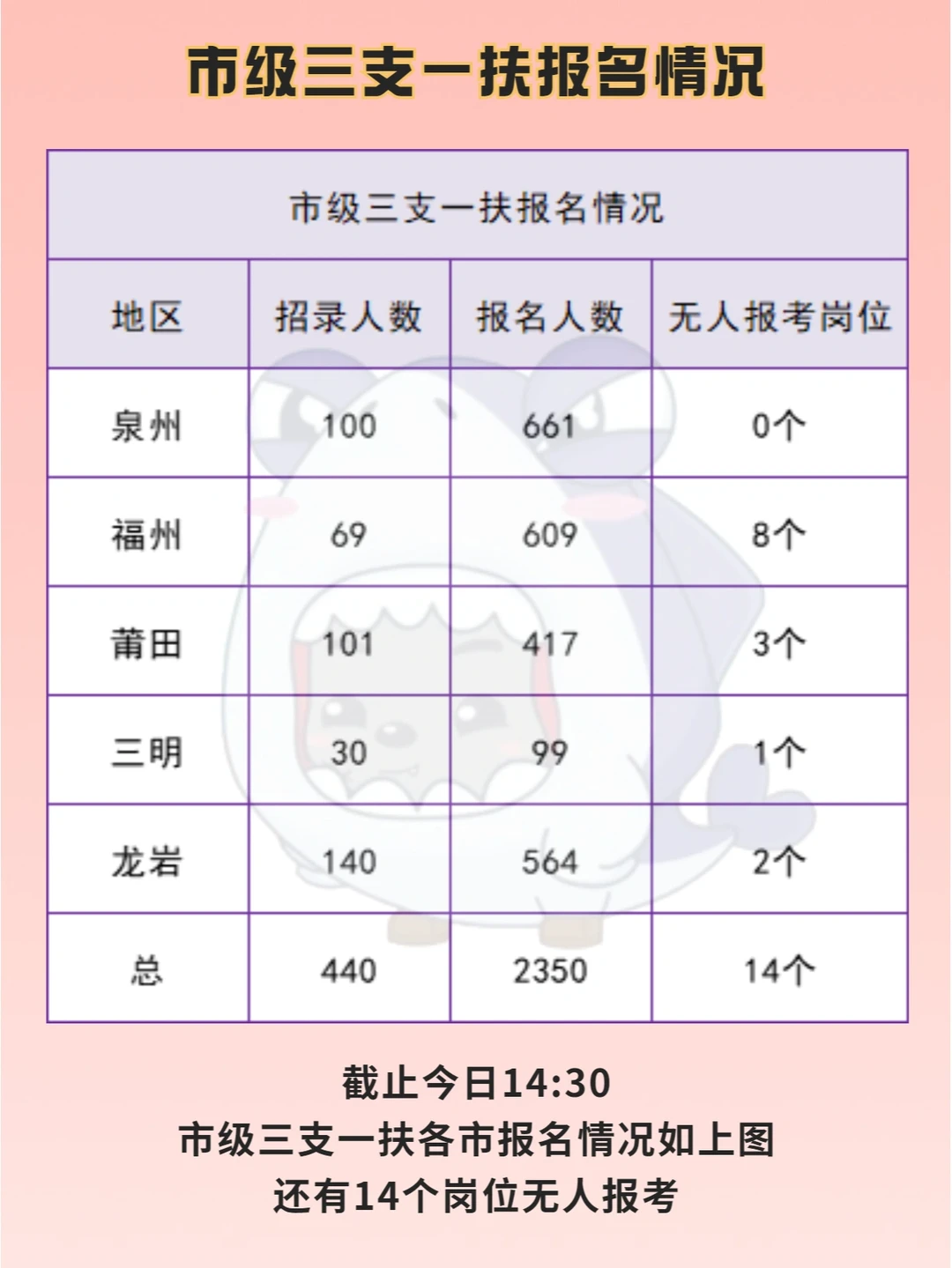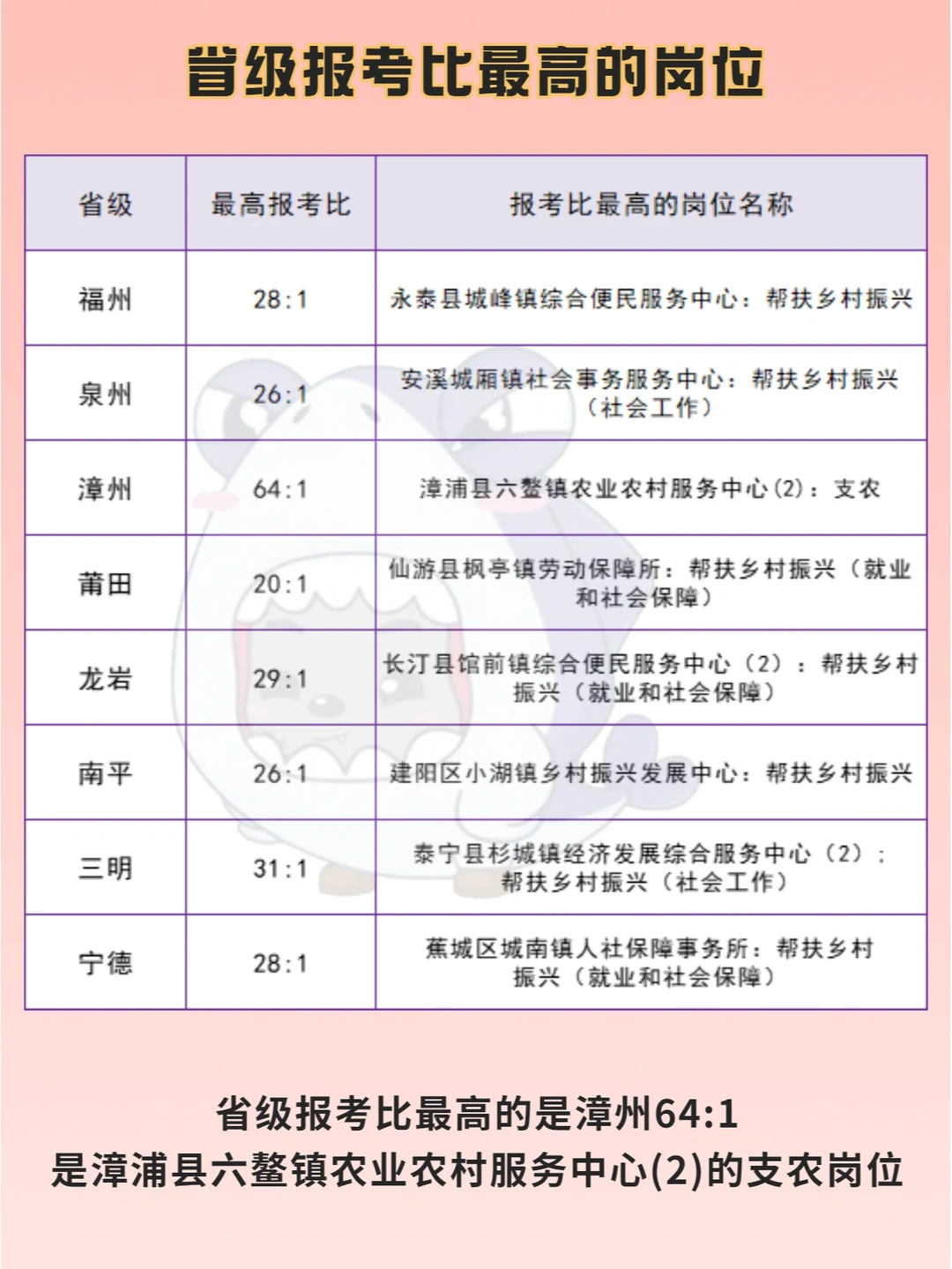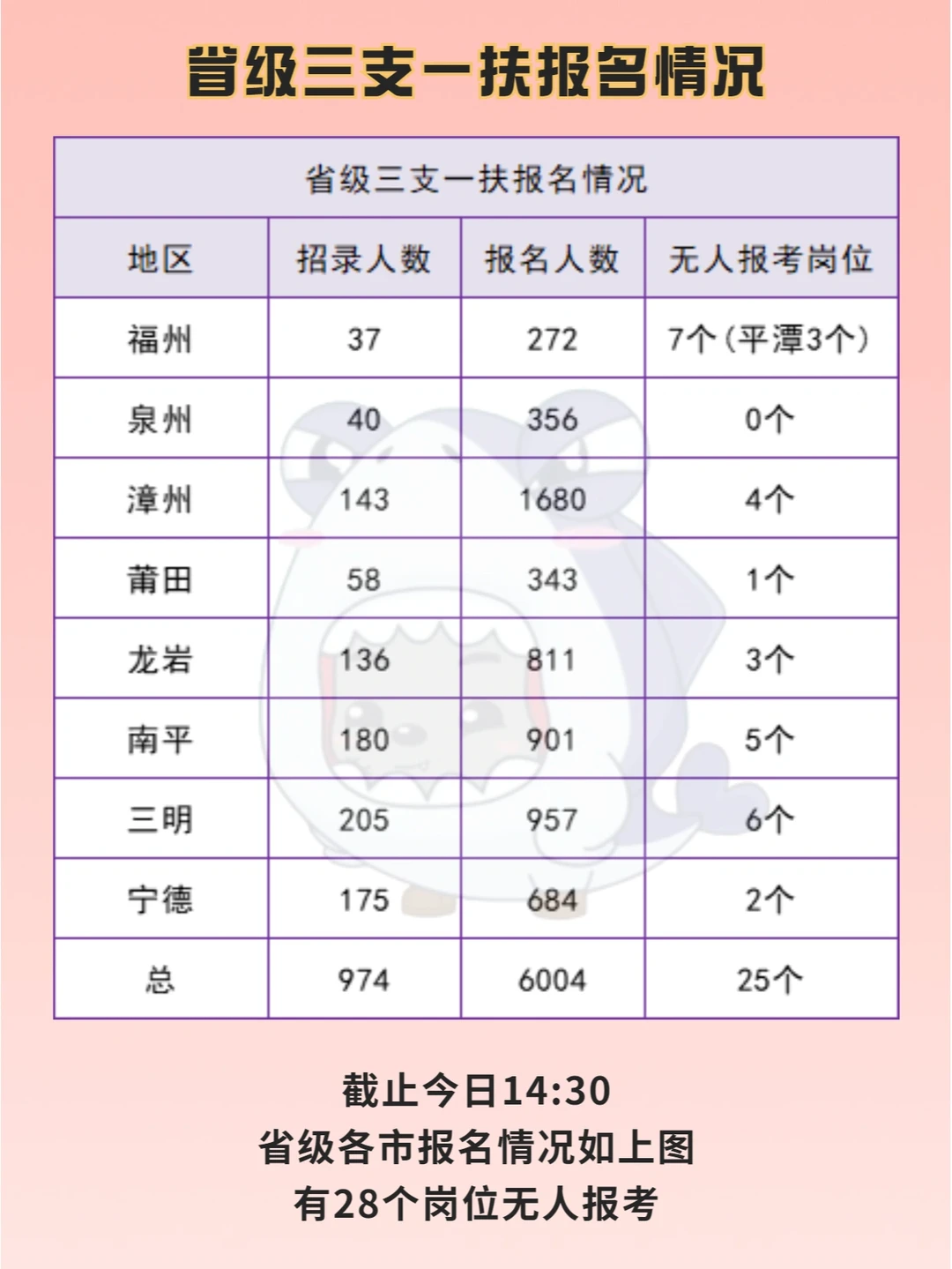 2022福建三支一扶报名情况: 🌈截止今日14:30 🌟省级招1008人,已有6224人报名,有28个岗位无人报考 🌟市级招440人,已有2350人报名,有14个岗位无人报考 - 🌸省级报考比最高的是漳州64:1,为漳浦县六鳌镇农业农村服务中心(2)的支农岗位,其次是三明31:1 🌸市级报考比最高的是福州34:1,有2个岗位,分别是罗源县飞竹镇综合便民服务中心的帮扶乡村振兴和罗源县松山镇综合。。队的支农岗位