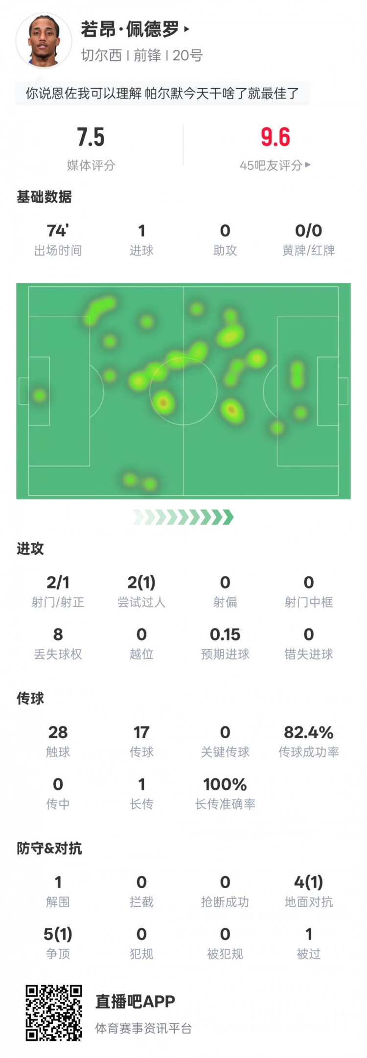 若昂·佩德罗本场比赛数据如下:
