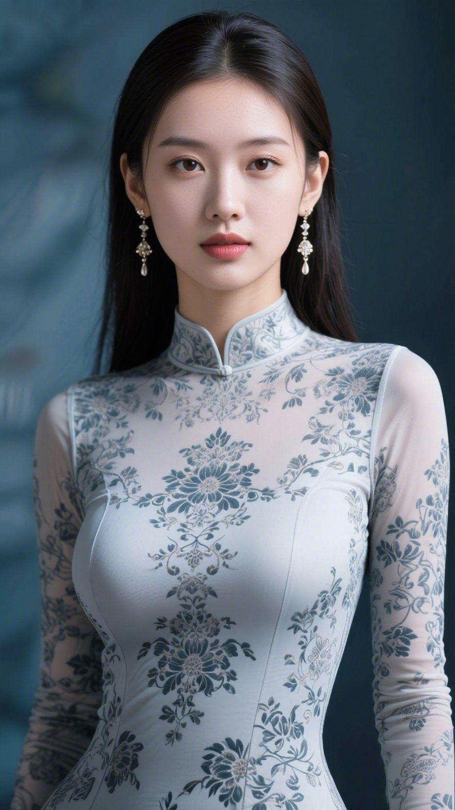 浅蓝旗袍凝雅致 墨蓝的背景晕着朦胧光泽,衬得这件浅蓝旗袍愈发温润。青花似的暗纹花饰在薄纱面料上流转,领口的盘扣与耳饰的银珠相映,把中式雅致的气韵都凝在了一身衣衫里。 站在这束光里,忽然想起江南巷弄里的蓝印花布——同样的浅蓝底色,同样的清雅花纹,藏着跨越时光的中式浪漫。我们总在追赶潮流里忘了回望传统,却忘了旗袍从来不是“复古”的符号,而是刻在骨血里的雅致表达。不必刻意模仿,不必迎合审美,身着这一袭浅蓝,就能在现代与古典间找到属于自己的平衡。 此刻没有喧嚣的人群,没有繁杂的琐事,只有旗袍的温润质感,与光影的温柔包裹。原来东方美从不在别处,就在这浅蓝的底色里,在这暗纹的花饰里,在每一次与传统温柔相遇的瞬间里。 浅蓝旗袍 东方雅致
