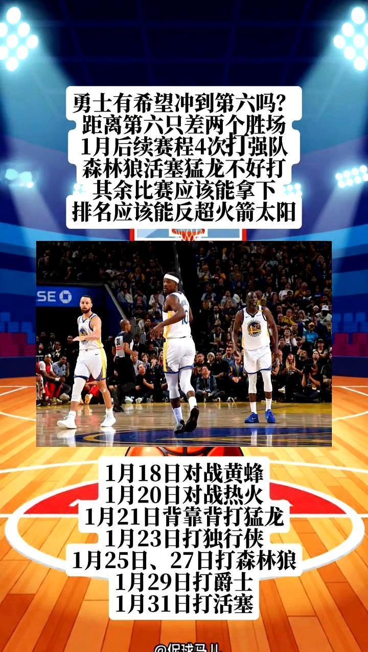 勇士现在23胜19负,卡在西部第七第八,离第六火箭就差两场球。说白了,这差距就是两场好球的事,一眨眼就能翻过去。 一月赛程前半段主场多,黄蜂、爵士必须拿下,丢一场都算犯罪。后半段全是硬仗,森林狼两碰、活塞客场、热火主场,全是防守磨人的主。想冲前六,这四场里至少得啃下一半,不然就等着打附加赛吧。 库里还在巅峰,但球队不能光靠他一人抡。角色球员得把空位三分扔进,防守别再漏人,不然再多主场也白搭。一句话,机会摆在面前,就看勇士自己争不争气。