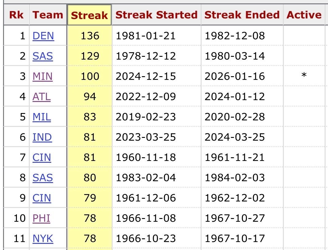 今天森林狼将连续单场得分至少100分的纪录延续到了100场,这是 NBA 历史上第三长的连续纪录。目前仍在延续的第二长纪录是24场,由独行侠和鹈鹕共同保持。NBA