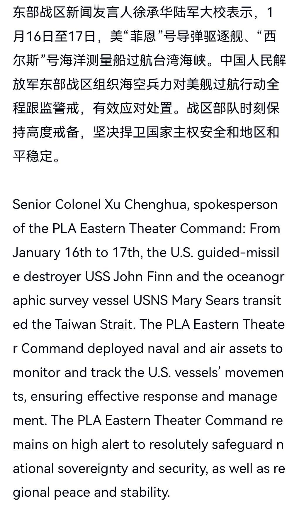 美国这样的国家就是欠收拾,一天到晚到处耀武扬威的,好像全世界都是它家后花园一样,想来就来想走就走。 简直是穷凶极恶,无法无天。 1月16日、17日。美舰、艇过航台湾海峡。 东部战区回应美舰艇过航台湾海峡。 战区部队时刻保持高度戒备,坚决捍卫国家主权安全和地区和平稳定。 这个回应也是相当的给力,美国也不敢在我们的地方放肆,最多也就是逛一下。