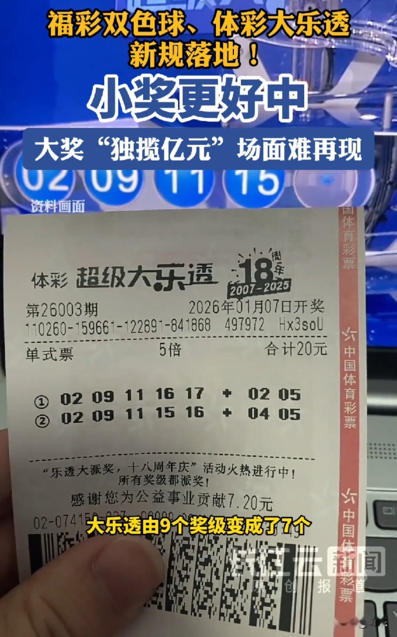 广大彩民有福了,2026年彩票新规来了,将加大中奖概率! 根据财政部官方批复,福彩双色球、体彩大乐透新规将于2026年1月底至2月初正式实施:双色球2月1日启动调整,大乐透1月31日生效! 核心变化一次说清,彩民必看: ✅ 选号规则不变,中小奖概率大幅提升!双色球新增“福运奖”——奖池超15亿元时,中3个红球就能拿5元,小奖福利更密集; ✅ 大乐透奖级从9级精简为7级,每个奖级奖金随奖池浮动,中小奖难度降低,奖金最高上浮33%; ✅ 高等奖设“天花板”:当期一等奖奖金总额封顶1亿元,独揽亿元大奖的场景将成历史。 重要提醒:彩票本质是公益娱乐,新规优化的是投注体验,绝非“必中保障”!请大家理性规划预算,小额投注图个开心,切莫滋生赌徒心理,远离非理性购彩行为~ 2026彩票新规 双色球新规 大乐透调整 理性购彩