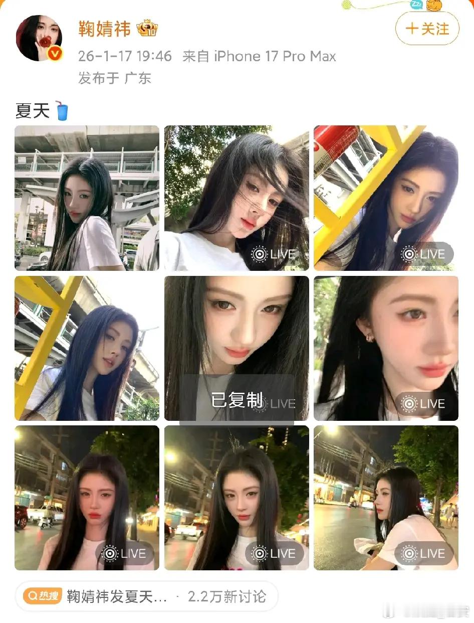 鞠婧祎发夏天九宫格鞠婧祎今天发微博啦❗❗❗1月17日,鞠婧祎更新微博动态,发了一组照片,配文:“夏天🥤 ”照片里小鞠穿的好单薄,想想这都已经1月份了,不应该啊,一看鞠婧祎ip地址在广东,那这就说的通了,不奇怪了,哈哈哈广东现在的天气确实是不冷不热的呢……