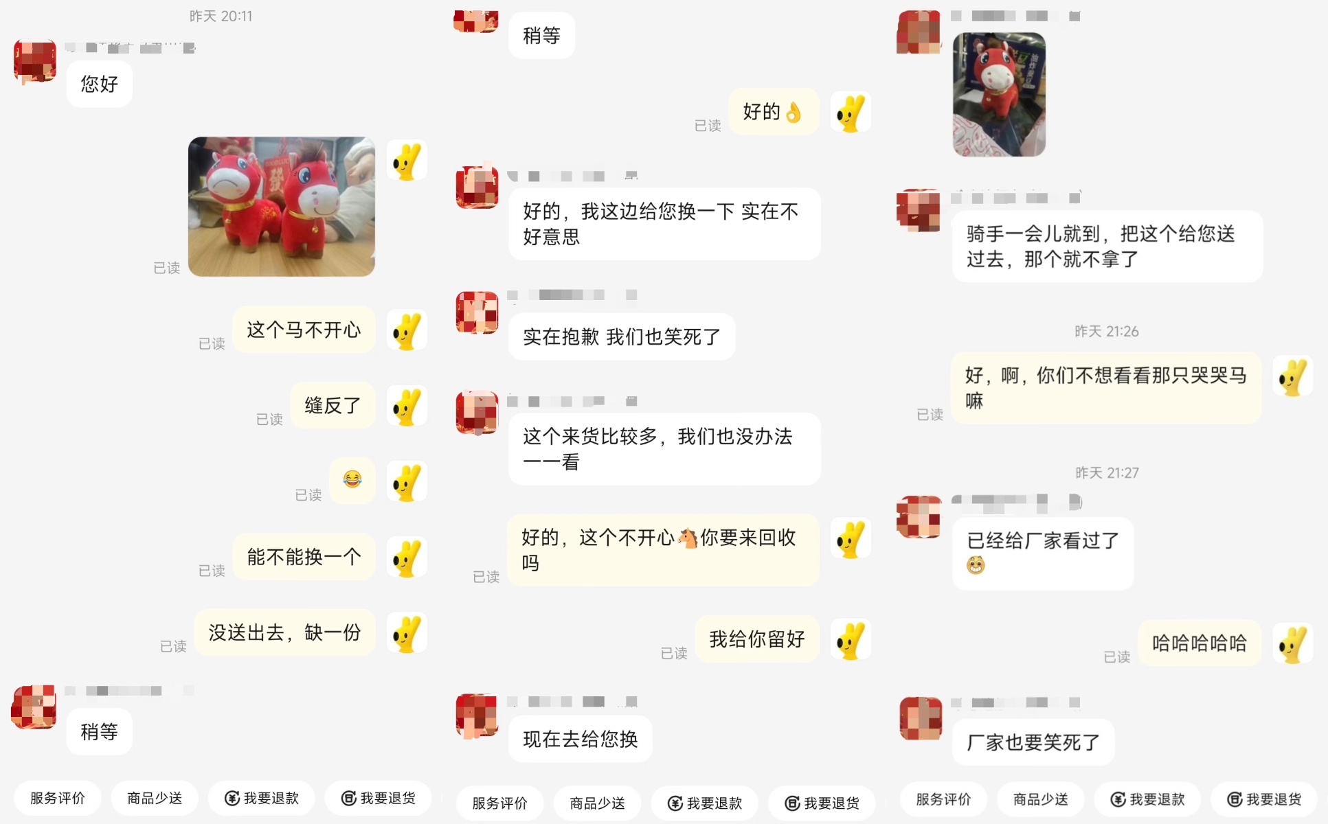 1月初,杭州萧山一家超市接到顾客反馈,对方发来照片,本该嘴角上扬的小马玩偶,被缝成了下垂的哭脸,神情委屈。超市里的人都笑了,当即联系厂家补发了一只“笑笑马”。
