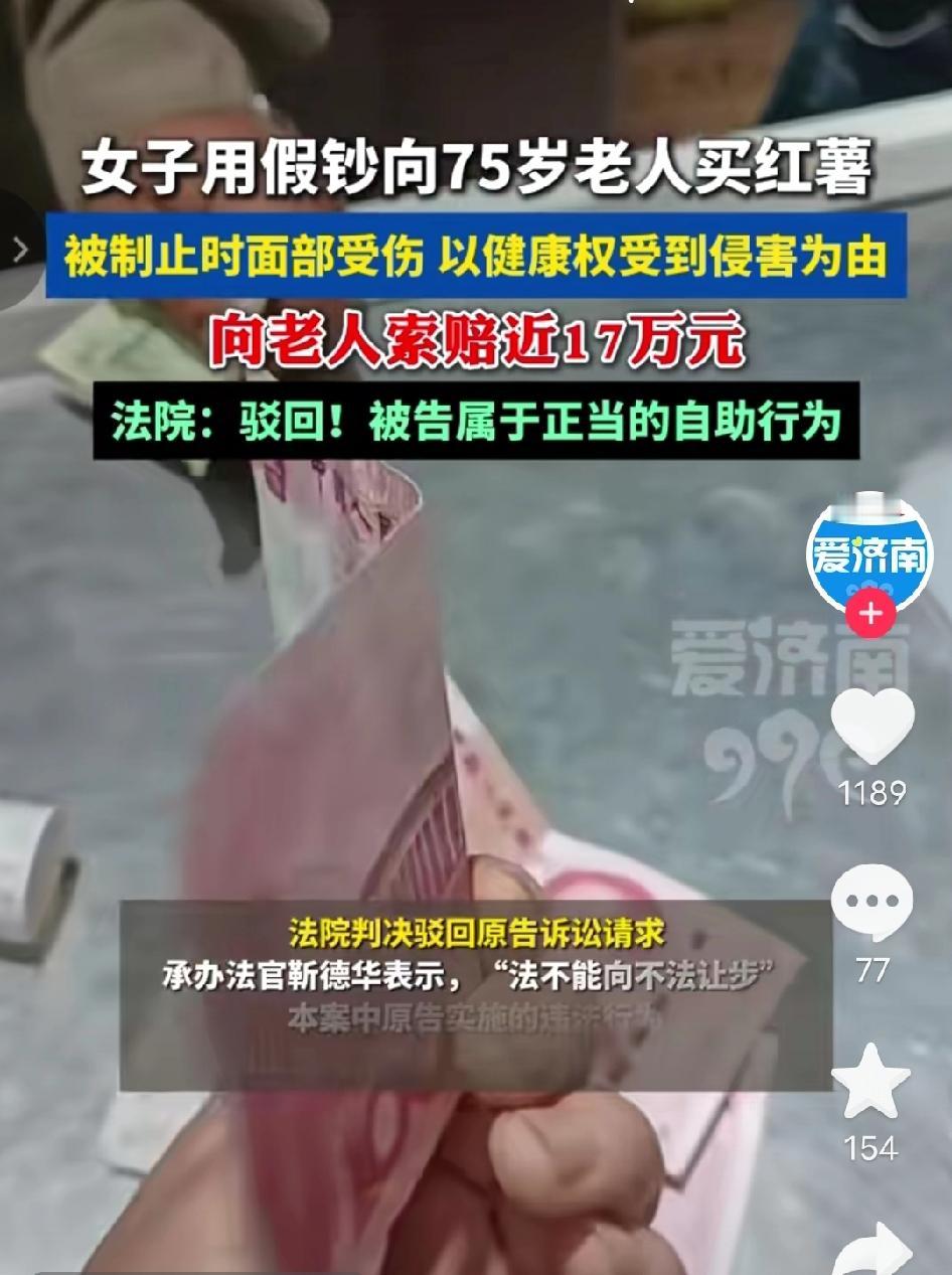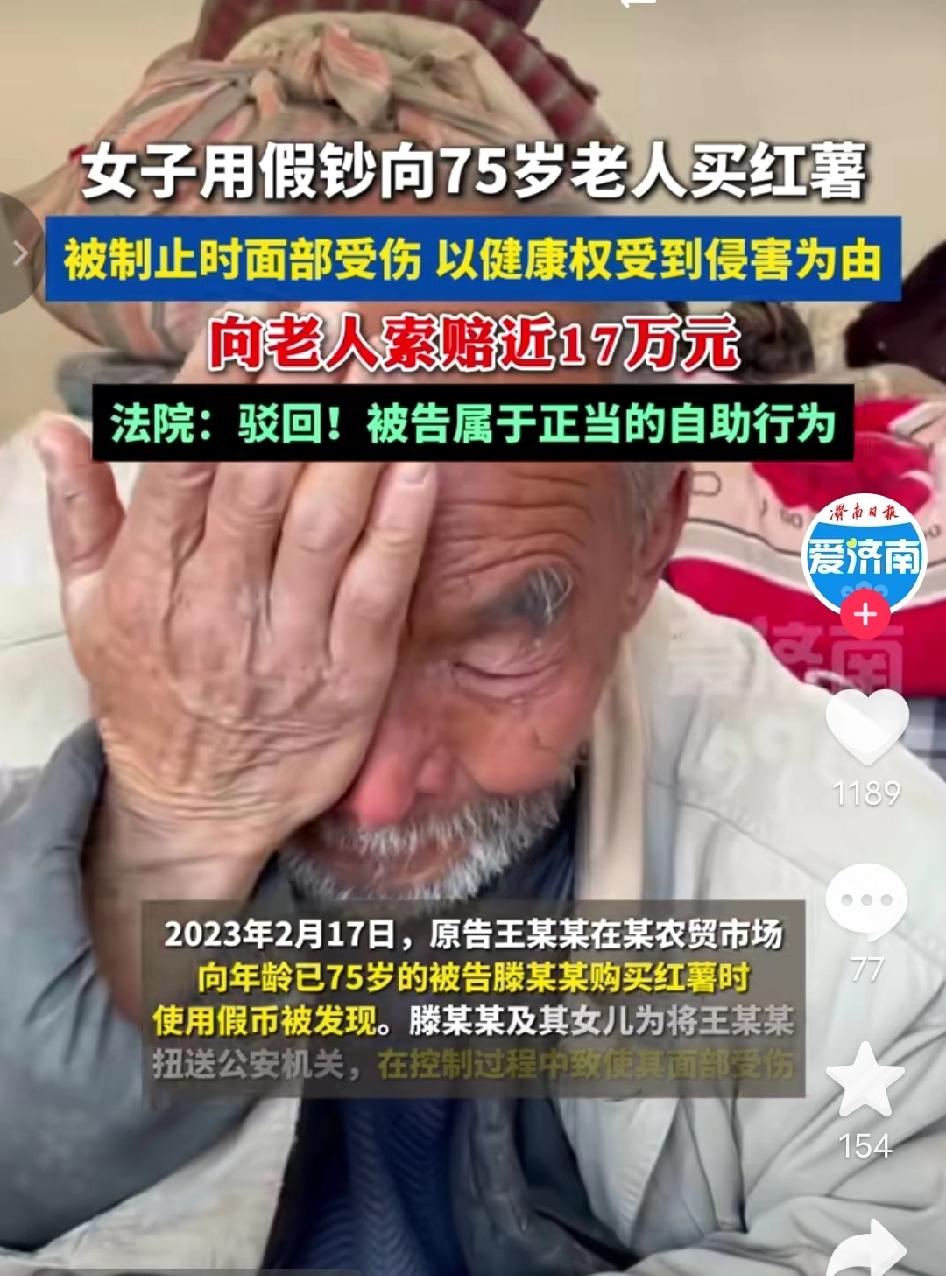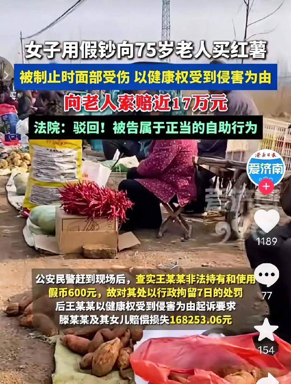 气到心窝疼!南京75岁卖红薯大爷收到600元假币,拦下骗子扭送派出所时轻微拉扯,竟被对方反咬一口索赔近17万,还好法院最终判决大快人心,守住了好人的底气! 清晨,天刚蒙蒙亮,南京老农贸市场里还透着刺骨的寒意,75岁的滕大爷早已支起了竹筐摊位,筐里码着刚从地里挖来的红薯,带着新鲜的泥土气。 这时,穿深色羽绒服的王某某踱步到摊前,目光扫过筐里的红薯,语气爽快:“大爷,挑些个头大的红薯,给我称600块钱的,带回厂里给同事当福利。”滕大爷笑得眉眼舒展,赶紧拿袋子麻利地装红薯,称好后递过去,满心欢喜接过对方递来的现金。 可指尖刚碰到钱,常年摸钱的触感就让他心里一沉,他捏着钱凑到晨光下反复翻看,纸质发软、水印模糊,连编号都透着不对劲。大爷眉头拧成一团,声音带着急切:“姑娘,你这钱不对啊,是假的!你赶紧换真钱,不然这红薯我不能给你。” 王某某脸色瞬间变了,伸手就要抢回假币,语气也硬了起来:“什么假钱?你这老头故意找茬讹人吧!我忙着呢,没空跟你废话!”说完转身就往市场外快步走,想趁机溜走。 滕大爷急得不行,这600块钱的红薯,得从地里挖多少筐、守着摊位卖多少天才能赚回来,他一把攥住王某某的手腕,指节因用力泛得发白,声音都有些发颤:“你不能走!用假币骗人可不行,今天必须跟我去派出所说清楚!”在旁边帮忙收拾摊位的女儿听到动静赶来,父女俩一左一右拦住王某某,搀扶着大爷的滕家女儿也跟着说道:“你用假币坑老人家辛苦钱,太不地道了,赶紧去派出所配合处理!” 拉扯间,慌乱的王某某没注意脚下,额头一下磕到了摊位边缘的竹筐架上,蹭破了一块皮,她当即尖叫起来:“你们打人了!还想动手是吧?我要报警抓你们!”可嘴上喊着,脚下却还在挣扎想脱身,滕家父女没松劲,牢牢拦住她,直到把人送到市场警务室,交给赶来的民警才松了手。 用假币坑辛苦摆摊卖红薯的老人,被拦受伤纯属自食恶果,半点都不冤 本以为事情到此就结束了,王某某因使用假币被警方处以行政拘留7日的处罚,可谁也没料到,几个月后,滕大爷父女竟收到了法院的传票。王某某恶人先告状,以“健康权受侵害”为由将父女俩告上法庭,张口就索赔医疗费、误工费、精神损失费等共计168253.06元,还在诉状里颠倒黑白,说自己是无辜路过买红薯,被滕家父女暴力殴打,导致面部留疤、无法正常上班,要求巨额赔偿。 法庭上,王某某哭得梨花带雨,对着法官哭诉:“我就是个外地打工的,挣点钱不容易,哪有什么假币,他们父女俩看我孤身一人,就故意欺负我,动手把我弄伤,现在我脸上留了疤,工作都受影响,他们必须赔偿我的损失!” 滕大爷坐在原告席上,气得双手发抖,拿起桌上的假币和当时的监控录像光盘,声音哽咽却字字清晰:“法官同志,我活了75岁,一辈子靠种红薯、卖红薯老实本分过日子,从没坑过谁、骗过谁。她用假钱骗我的血汗钱,我只是想把她送到派出所讨个公道,从头到尾都没故意打她,监控能证明一切啊!”滕家女儿也跟着补充,提交了当时民警出具的情况说明,证明父女俩是正当阻拦不法行为。 法院审理后,结合监控录像、假币物证和民警证言,当庭作出判决:滕大爷父女的行为属于正当自助行为,目的是阻止不法分子逃跑、维护自身合法财产权益,且全程没有过激行为,阻拦后第一时间移交民警,完全符合法律规定,最终驳回王某某的全部诉讼请求,还了滕家父女一个清白公道。 法院这判决太硬气!法永远不向不法让步,既护了老人权益,也给好人撑了腰,网友们看到这事也彻底炸锅,纷纷留言热议: - “用假币坑老人辛苦钱,被拦受伤还反咬一口索赔,这人心也太黑了,道德都丢了!” - “必须给法院点赞!要是真判老人赔偿,以后谁还敢管这种不法的事,好人该寒心了!” - “75岁大爷凌晨出摊卖红薯多不容易,这女的不仅违法还耍无赖,真该好好惩治!” 75岁老人的辛苦钱,不该被辜负。换作是你会站出来吗? 假币坑卖红薯老人反索赔 法不能向不法让步 老人摆摊遇骗局 正义不缺席 争议民生 来源:爱济南新闻客户端 2026-01-07号报道