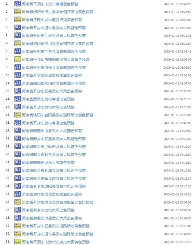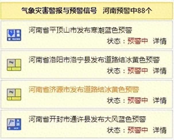 据预报显示,河南多地发布寒潮、大雾、大风及道路结冰等预警,截至1月18日8:45,共有88条预警生效中!
