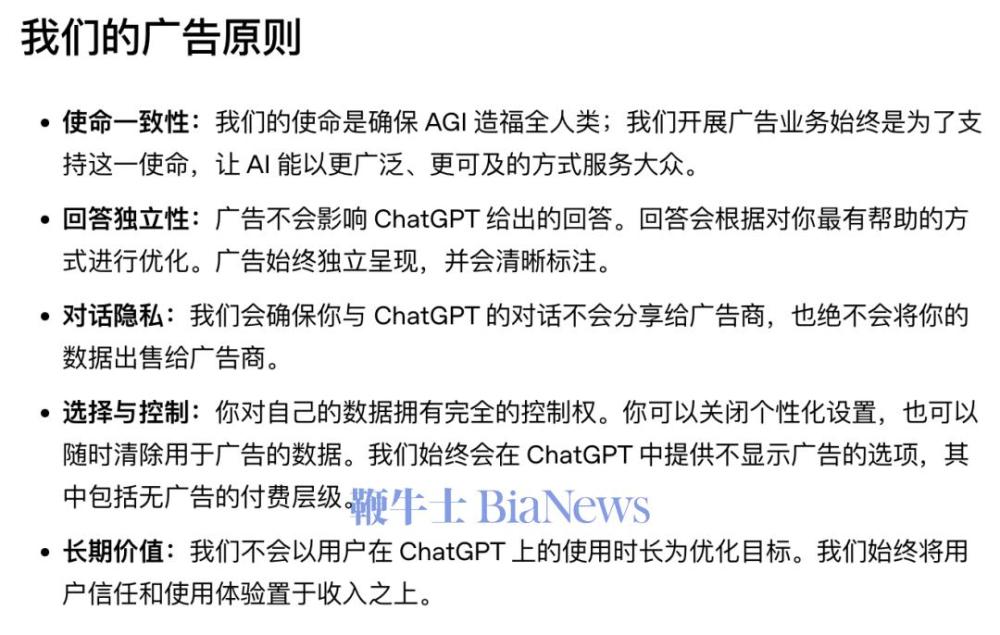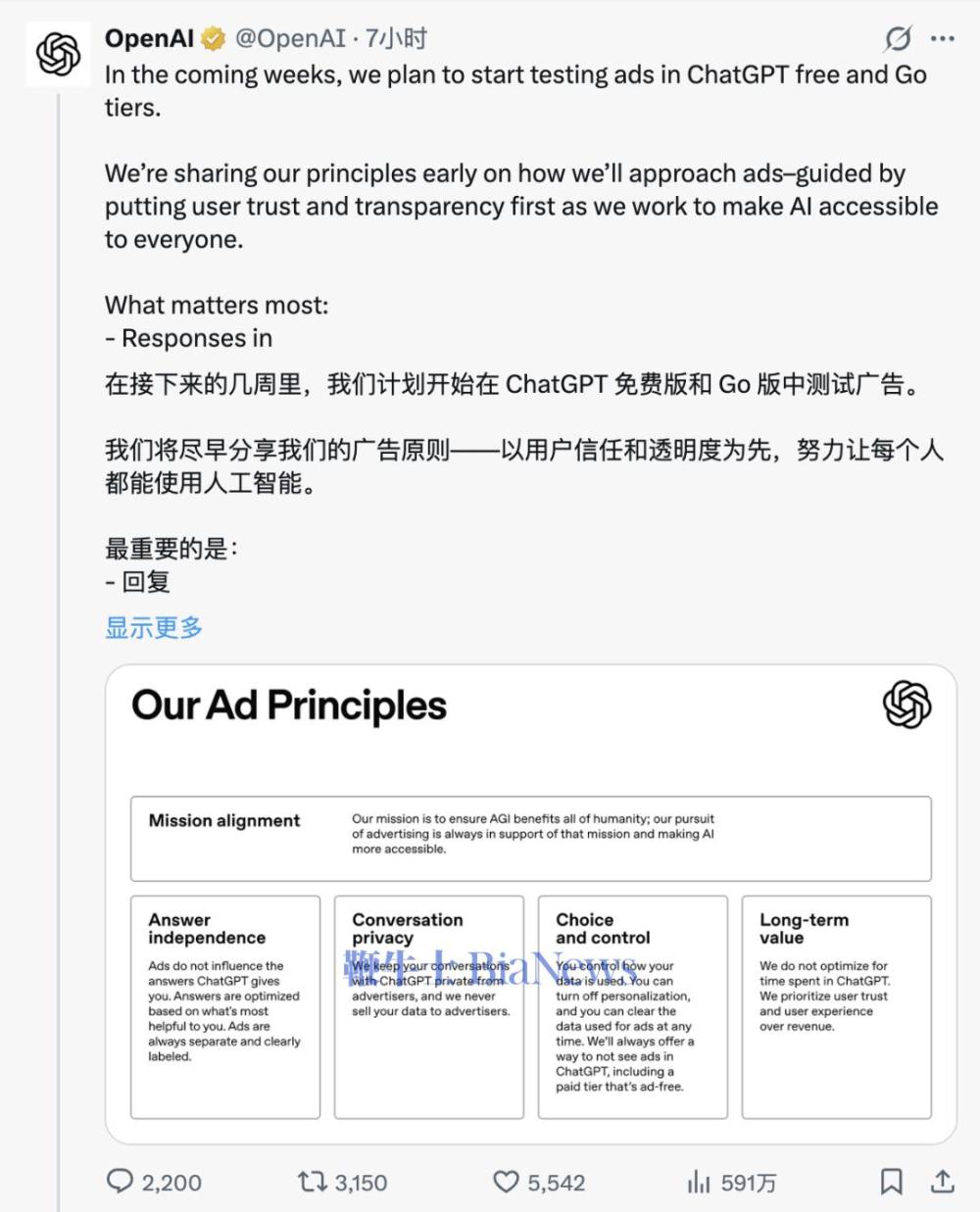 OpenAI给出的理由很坦诚:引入广告是为了让更多人在免费或低门槛的情况下用上工具,毕竟昂贵的算力成本摆在那里,要实现「AI普惠」的愿景,多元化的收入势在必行。