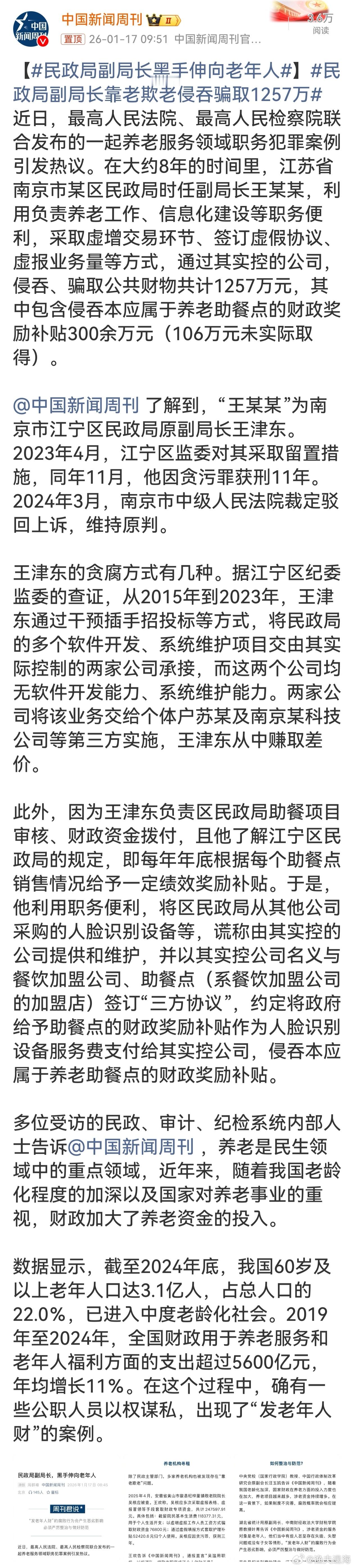 民政局副局长黑手伸向老年人南京市江宁区民政局原副局长王津东靠老欺老,8年侵吞骗取1257万养老资金,手段恶劣。养老是民生重点,国家加大投入本为改善老人生活,他却将黑手伸向老人,严重损害群众利益。必须严惩此类腐败分子,强化监管,确保养老资金安全,守护好老年人的幸福钱。