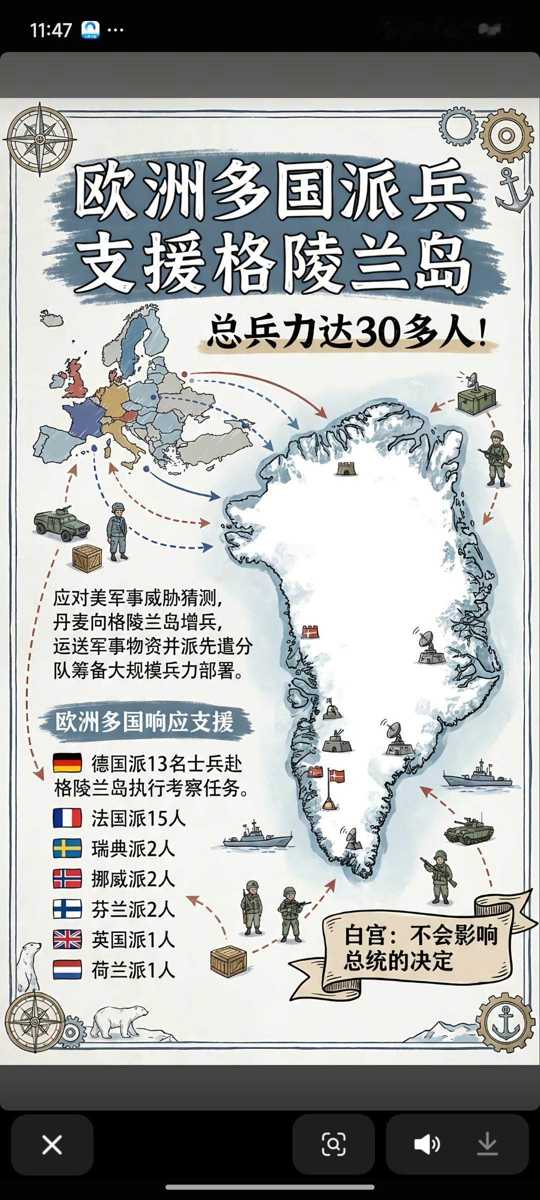 八国联军 这次大规模军事调动 在世界历史上也是罕见的 团结的欧公子居然集结了37人的庞大团队 不可小觑啊 整整出动了一个大巴车的兵力 法兰西出兵15人 德意志出兵13人 大英帝国足足出动一个人 美利坚表示 这不影响他们拿下格陵兰岛 并且要对八国联军全部加征10%关税 而且到2026年6月开始 加征关税的税率将提高的25% 并且表示该税率一直到 他们完全成功购买到格陵兰岛为止
