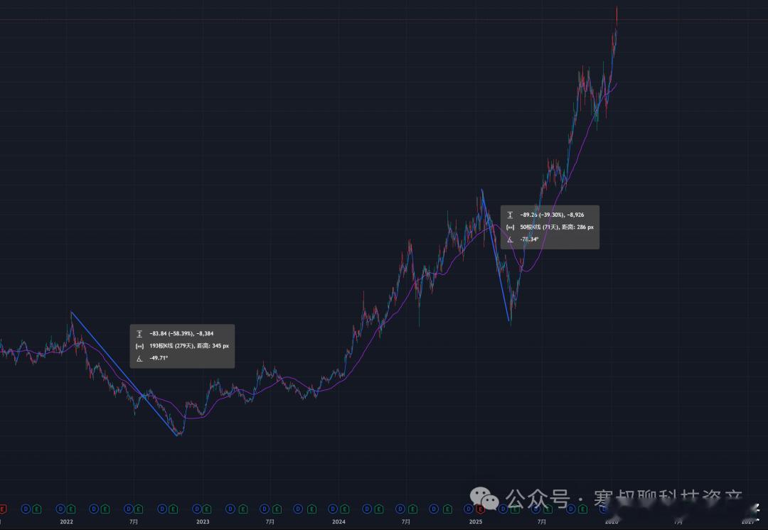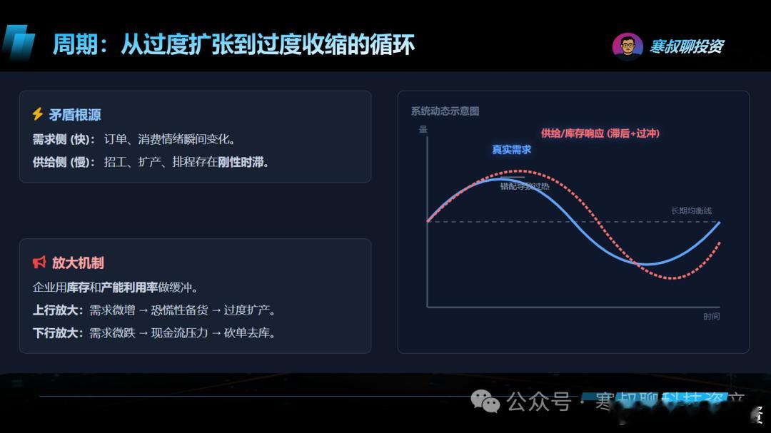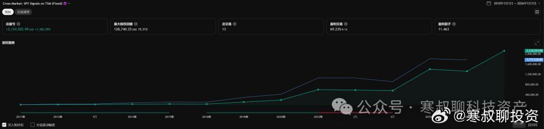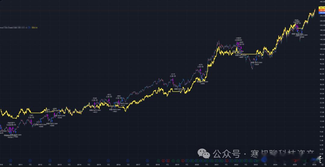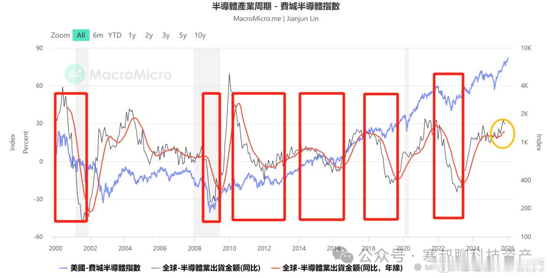 “AI 泡沫与周期风险”,台积电财报告诉我们什么?(5)五、风险和应对(1)半导体周期接近顶部历史和经济规律告诉我们,没有只涨不跌的资产金融市场千变万化,不变的是人性和周期下图是从1997年开始费城半导体指数SOX的10个牛熊周期,我们可以看出熊市的平均下跌时间316天,下跌幅度41%;牛市平均上涨时间574天,上涨幅度164%;如果遇到熊市半导体个股跌个50%是家常便饭在过去,半导体周期呈现明显的周期性主要是因为芯片下游产品需求虽然也有周期,但不稳定;并且芯片产业链长,产能的变化速度远远落后于需求,周期性出现供过于求和供不应求,这是芯片股股价周期性的重要原因;下图红线是全球半导体销售同比,蓝线是费城半导体指数每当半导体销售触顶下行的时候,都对应费城半导体指数的下跌(就是上面说的熊市)现在半导体周期,大概率已经走了一大半我们在之前也经常说,股价的变化不是经济和企业盈利,甚至不是预期,而是预期的变化;(3)为什么半导体指数和个股波动这么大?半导体周期的波峰,往往不是由真实需求堆出来的,而是由“对缺货的恐惧”放大的。源头的恐慌(Meta/Microsoft): 假设 Meta 真实需求是 10万张 H100。但在缺货焦虑下,为了防止被对手抢光,扎克伯格会为了“安全感”额外多下 5万张 的防御性订单。信号的失真(Nvidia): 当所有巨头都这也做时,英伟达看到的不是增长,而是海啸。为了不丢单,黄仁勋必须向台积电“锁死”所有先进封装产能。因为产能是滞后的,黄仁勋担心未来更多订单所以向台积电锁定20万张H100产能最后 终端真实需求可能只涨了 30%,但经过层层加码,传导到上游时,需求看起来像涨了 100%。上游厂商之所以停不下来,是因为“产能建设的时间滞后”。决策的延迟: 台积电盖新厂、从打地基、向阿斯麦定光刻机、到量产,周期起步 18个月。这意味着,今天的产能释放,其实是回应一年半以前的疯狂订单。沉没成本: 假设今天 AI 需求突然降温。台积电无法叫停,因为地基已打、百亿设备款已付。停工的代价比亏本生产更大。残酷的结果: 就像一列高速行驶的重载货车,即便踩了刹车(需求下降),巨大的物理惯性也会让新工厂在明年准时完工,向一个已经不需要的市场疯狂吐出芯片。这就是周期杀跌最惨烈的原因。我们在社群中也讲过,周期的本质是从过度扩张到过度收缩的循环(3)风险应对我们经常说的,投资需要用宏观分析+概率和统计,才能获取长期的稳定收益,每个人都应该建立自己的投资系统虽然台积电是全球半导体无可动摇的龙头,正因为这种周期性过度扩张和过度收缩,波动也同样惊人比如刚过去的2022年熊市跌了58%,贸易战下跌39.3%我们研究了一个台积电的交易策略,能躲过大部分跌幅:并且享受大部分持有不动的收益:下图黄线是策略的净值曲线,k线为台积电股价走势我们大致可以看出净值曲线在大跌的初始阶段开始走平线(空仓)在大跌中的表现:2008年金融危机(高点回撤):买入并持有回撤63%,该策略回撤15%2022年熊市表现(最高点回撤):买入并持有回撤47%,该策略回撤15%从2010年至今,该策略总收益2124%(约21倍),买入并持有总收益约(31倍)最大 回撤15%,而对比买入并持有的最大回撤58%总交易比如13笔(买卖算一笔)胜率69%,13笔交易中9笔盈利4笔亏损盈利因子(交易累计盈利/交易累计亏损)11.46策略总结:更加安心持有全球科技龙头用更少的收益20倍(少于买入并持有的30倍)换取更少的回撤15%(买入并持有回撤58%);如果对58%的回撤无所谓,那么买入并持有是不错的选择。更多个股及半导体等各类指数的策略,交易方法,以及其他宏观分析内容见社群。
