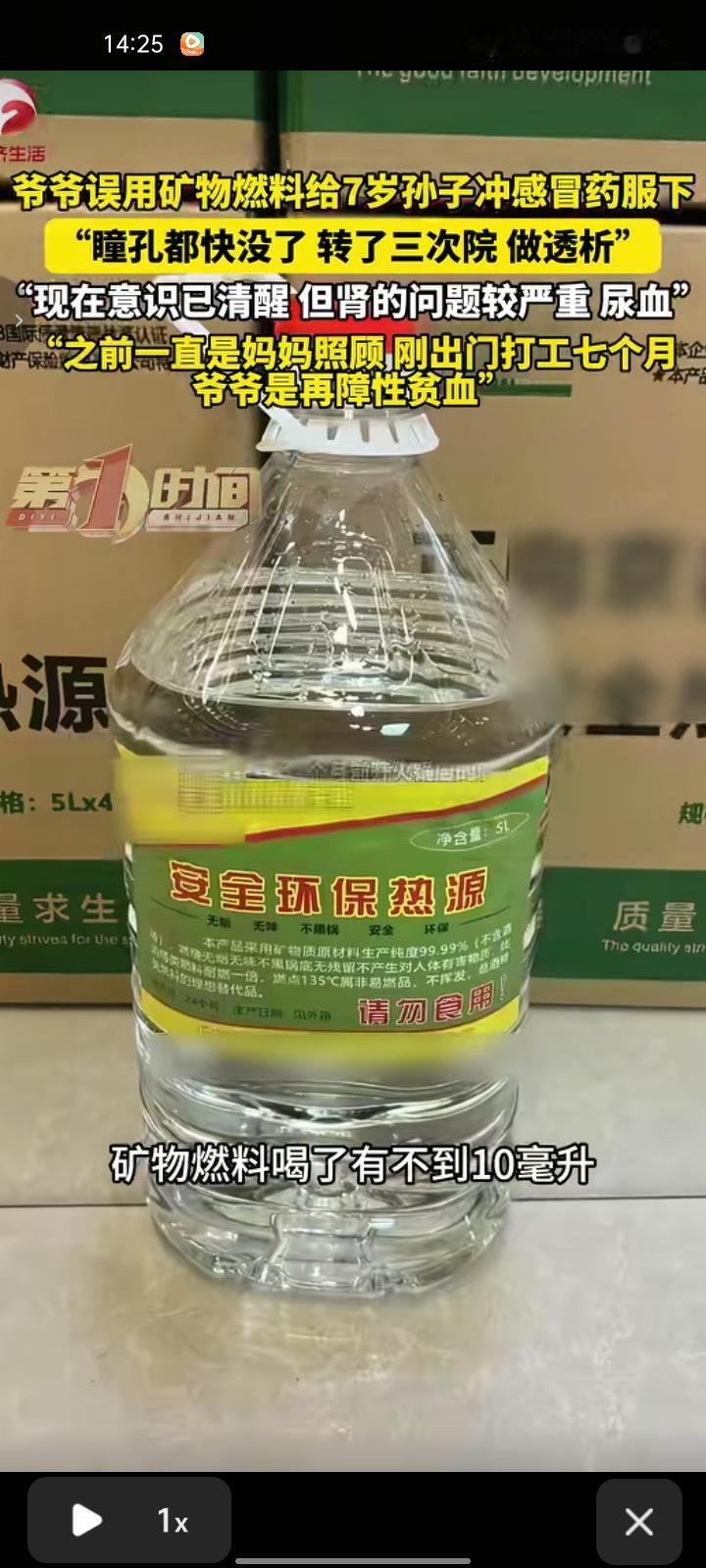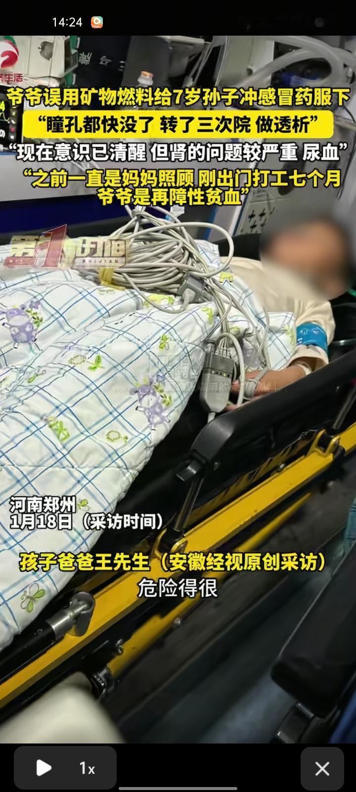1月17日,河南郑州。王先生是河南周口人,事情发生于1月16日,他七岁儿子误服烧火锅的矿物燃料,矿物燃料喝了不到十毫升,透亮的像水一样。儿子服用矿物燃料后,很快出现了不适。孩子爷爷尝了一口发现不对劲,送孩子到医院后孩子已经昏迷。孩子现在意识清醒,就怕有后遗症。 王先生表示,孩子之前一直是妈妈照顾,刚出门打工七个月,爷爷是再障性贫血。现在,王先生已经收到一些爱心人士捐助的善款。