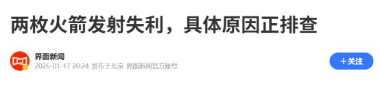 中国航空的“黑暗时刻”!2026年1月17日,1日的时间,两枚火箭发射失利!国际高度关注,谷神星二号首飞遇挫! 因为我国在载人航天,空间站等方面发展非常优秀,所以我国的火箭发射备受国际高度关注。毫不夸张的说,有些关于航天的消息,国人在不得知的时候,外媒就已经第一时间报道。 国际高度关注我国的火箭发射,那么自然当出现失利事件的时候,同样也会备受关注。就在2026年1月17日的时候,一则重磅消息引爆国际,同时成为国内关注焦点。 在当天我国出现了两枚火箭发射失利的情况,而这两枚火箭分别来自于国家队以及民营企业。在当天凌晨的时候,我国在西昌卫星发射中心使用长征三号乙运载火箭发射实践三十二号卫星。 这本是一个非常平常的发射行动,但却出现了意外,火箭在飞行的时候出现异常,致使发射任务失败。就在相关部门就这件事情,进行分析排查时,发射失利同时上演。 在当天中午的时候,星河动力谷神星二号民营商业运载火箭在酒泉卫星发射中心点火升空。而在发射的时候就出现了同样的情况,火箭飞行异常,致使飞行任务失败。 短短1日内,两枚火箭发射失败。此事成为国内外关注焦点,相关部门也在进一步的去分析排查。在外媒高度报道这件事情的时候,我国的反响则十分的冷静。 航天发展风险性本就极高,失败的可能性更是层层叠加。所以对待这一点,不少网友认为应该学会在失败中前行。 对此,您怎么看? (信息来源:两枚火箭发射失利,具体原因正排查-界面新闻)