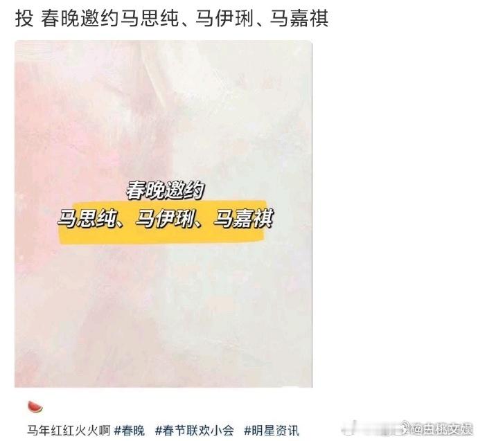 马思纯、马伊琍、马嘉祺收到春晚邀约的消息备受关注,三人各有特色适配舞台。马思纯的抽象广告自带话题,马伊琍风格多变气场强,马嘉祺活力满满,同台将碰撞别样火花。春晚邀约马思纯马伊琍马嘉祺马思纯马伊琍马嘉祺春晚
