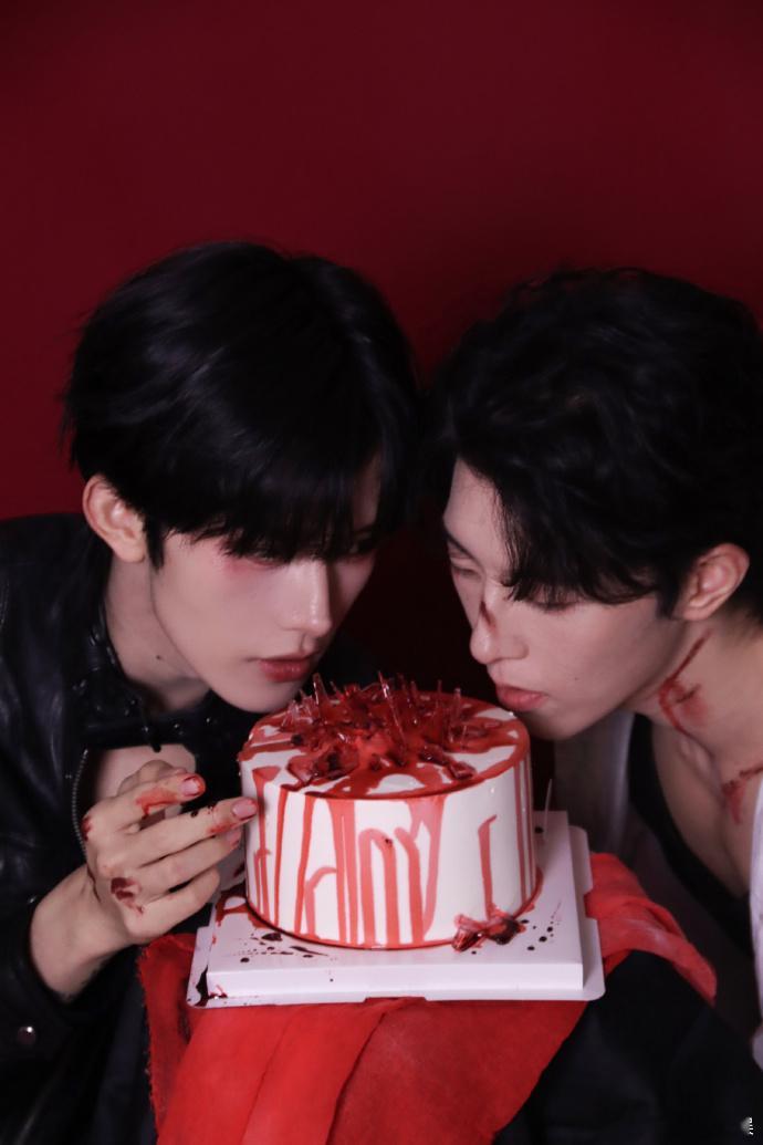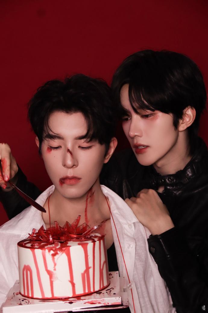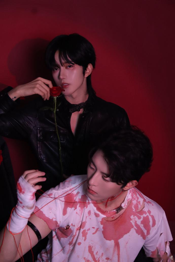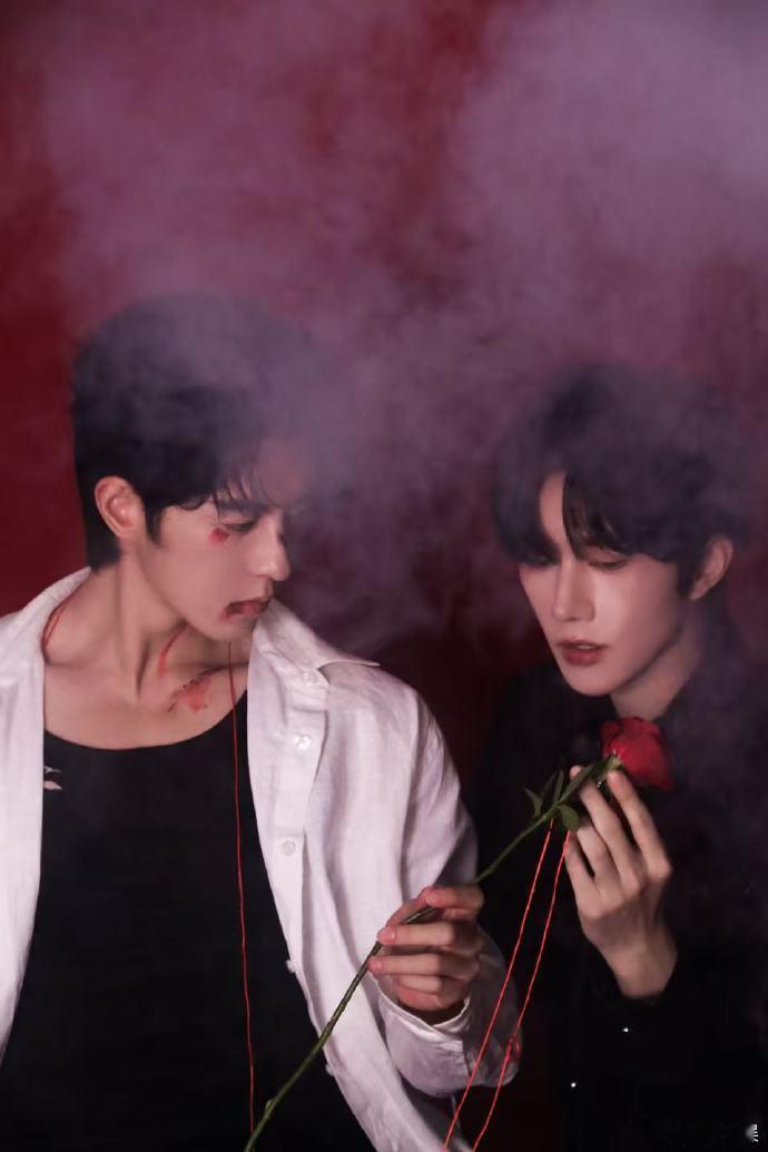 黄星邱鼎杰的吸血鬼妆造细节满满,从妆容到服饰都紧扣哥特主题。新合照中两人的肢体互