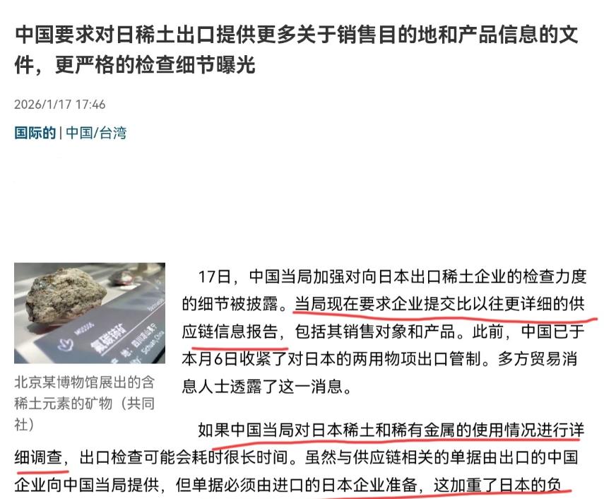 日本回过味来了,没想到中国的管制力度这么大!1月17日,根据日媒报道,中国当局加强对向日本出口稀土企业的检查力度的细节被披露。中国现在要求企业提交比以往更详细的供应链信息报告,包括其销售对象和产品。文件要求提供的信息包括: 其一,稀土最终将用于哪些产品;其二,最终销售公司和中间商的信息;其三,在日本生产的产品是否会出口到美国等第三国。 再看咱这次严查的三个要点,每一个都精准对应着现实风险,压根不是无的放矢。 要求提供稀土最终用途,是怕日本把咱的稀土用到军工装备上,这些年日本不断突破和平宪法,加码军购、研发先进武器,万一用中国稀土造出来的装备,反过来针对咱们,那岂不是养虎为患? 要求提供中间商和最终销售公司信息,是防着有人钻空子,搞层层倒手浑水摸鱼,毕竟稀土是战略资源,不是普通商品,必须全程可追溯,杜绝违规流转; 要求核查是否出口到美国等第三国,更是直接戳破了美国的小心思,美国现在手里一堆烂摊子,忙着抢格陵兰岛、盯着委内瑞拉,没精力直接跟中国掰扯稀土,就想借着日本这个中间商,拿中国稀土补自己的供应链,不管是F-35战斗机还是高端永磁体,美国都缺不了重稀土,咱 这一查,直接断了美国借道日本薅羊毛的念想。 说到这里就得提一句,别以为日本能找着中国稀土的替代,这事压根不现实。 美国不是有个MP稀土矿吗,号称是美国本土唯一稀土矿企,还砸了10亿美元想搞自主产业链,结果呢? 这家公司80%的营收,全靠把稀土精矿卖到中国来提炼 ,自己连重稀土分离技术都没有,就算建了精炼厂,也只能处理轻稀土,像制造高端永磁体必需的镝和铽,它压根搞不定。 澳大利亚的莱纳斯公司,算是中国之外最大的稀土分离企业,就算建了新工厂,还是得把稀土氧化物运到中国精炼,专家都说至少2026年前,它都离不开中国的技术支持 。 日本想拉着这些国家搞所谓的稀土联盟,说白了就是画饼充饥,没有中国的分离提纯技术,就算有再多稀土矿,也只是一堆石头,成不了能用的产品。 这些年中国稀土产业早就不是当年那个低价卖资源的局面了,咱们掌控着全球90%以上的稀土精炼产能,尤其是重稀土分离技术,更是独一份的优势,这不是垄断,是几十年技术沉淀换来的硬实力。 早年咱们低价出口稀土,不仅没赚到多少利润,还赔上了生态环境,现在咱们按市场规律办事,加强供应链管控,本质上是把资源优势转化为发展优势,让稀土产业回归合理价值。 日本要是真的想稳定稀土供应,压根不用慌,只要规规矩矩做生意,不把中国稀土用到歪路上,不搞转手倒卖的小动作,正常的贸易合作完全不受影响,可他们偏要揣着明白装糊涂,一边依赖中国稀土,一边跟着美国搞对抗,这才是他们心慌的根源。 其实明眼人都能看出来,中国加强稀土出口管控,既是对自身资源和生态负责,也是对全球产业链稳定负责。 稀土是高端制造业的基石,不管是新能源汽车还是5G通信,都离不开它,中国严格把关供应链,能避免稀土被滥用,避免被用于军事领域,这对全球安全稳定也是好事。 反观美国和日本,一边喊着供应链稳定,一边搞地缘政治操弄,美国想把稀土当成遏制中国的筹码,日本想靠着稀土拿捏产业优势,到头来只会搬起石头砸自己的脚。 日本现在回过味来,意识到中国管制动真格了,这不是坏事,至少能让他们认清现实:中国的资源,中国说了算;中国的规则,必须无条件遵守。 别再想着用双标话术抹黑中国,别再想着靠着投机取巧绕过管控,更别想着跟着美国火中取栗。 稀土合作的大门永远敞开,但前提是平等互利、遵守规则,若是执迷不悟,非要把稀土问题政治化,到头来只会让自己陷入供应链断裂的困境,得不偿失。 说到底,稀土不是谁的武器,但也绝不是可以肆意挥霍、随意滥用的普通商品,中国加强管控,守住的是资源底线,是生态红线,更是国家安全的防线。 日本也好,其他国家也罢,唯有尊重中国的主权,遵守国际通行规则,才能实现稀土领域的长期稳定合作,这既是现实选择,也是唯一正道,任何心存侥幸的算计,最终都只会落空。