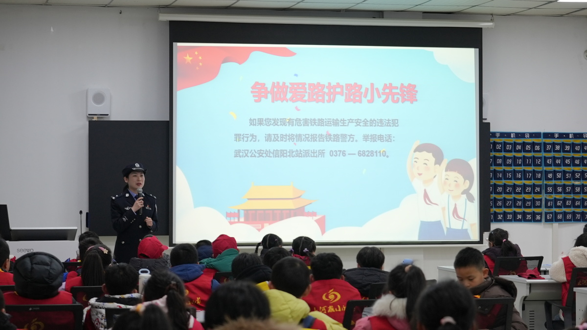 活动的最后一站,信北所民警于奇卉为小记者们带来了一堂干货满满的法制安全教育课。精心准备的PPT图文并茂,反诈小视频意趣盎然,民警围绕铁路线路安全、高铁乘车规范、反诈防骗技巧三大核心内容展开讲解——从"不得翻越铁路防护栏"的硬性规定,到乘车时"跟紧爸爸妈妈、保管好随身物品"的细节提示,再到针对未成年人的诈骗套路拆解,每一个知识点都结合真实案例,实用又好记。