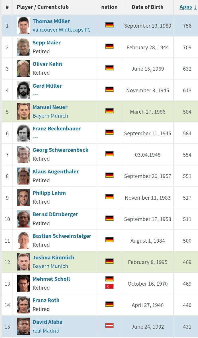 这一数据追平弗朗茨-贝肯鲍尔,跻身拜仁队史出场榜前五。