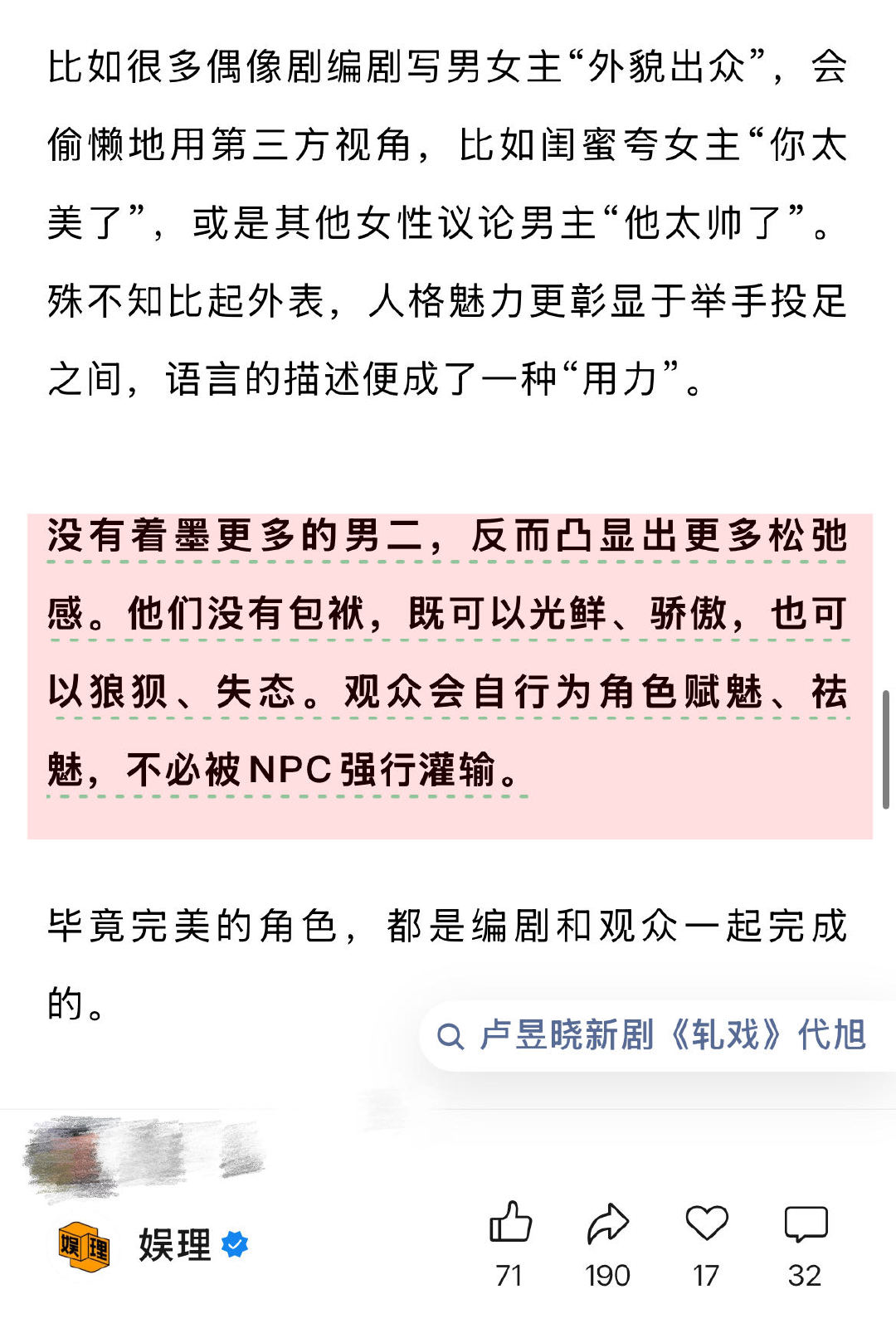 业内谈代旭走红上桌 编剧称很多男配人设比男主讨喜 为了避免被“审判”,产生舆情,男主还要爱得高级、有分寸,不能做太出格的事。他们要感情专一、单纯,甚至要保持身体“单洁”,这便会冲撞角色的行为逻辑。而男配的作用是提供情感支点,为推进主角情感服务。这些缺点让男二们更完整,更真实,更像现实存在的人。娱理独家↓