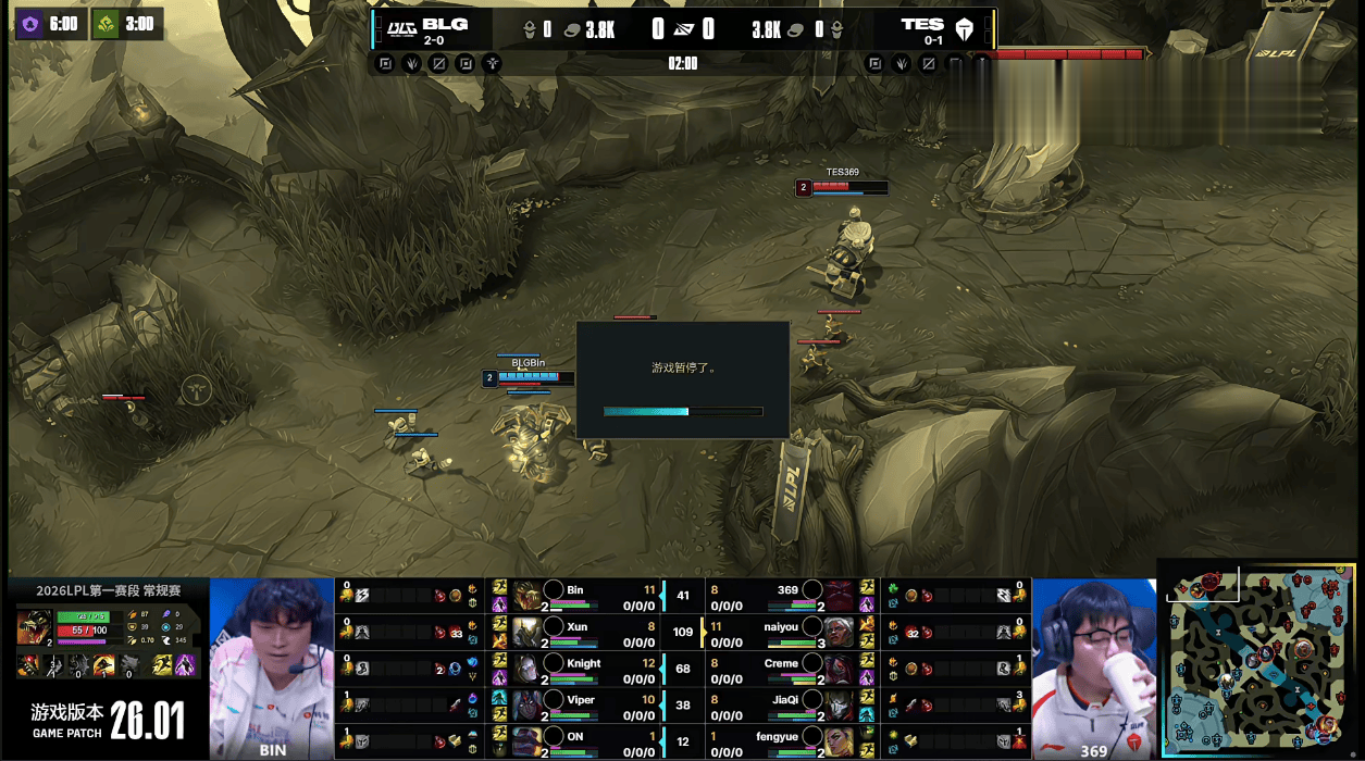 TES对阵BLG第一局进行至2分钟时,游戏发生暂停