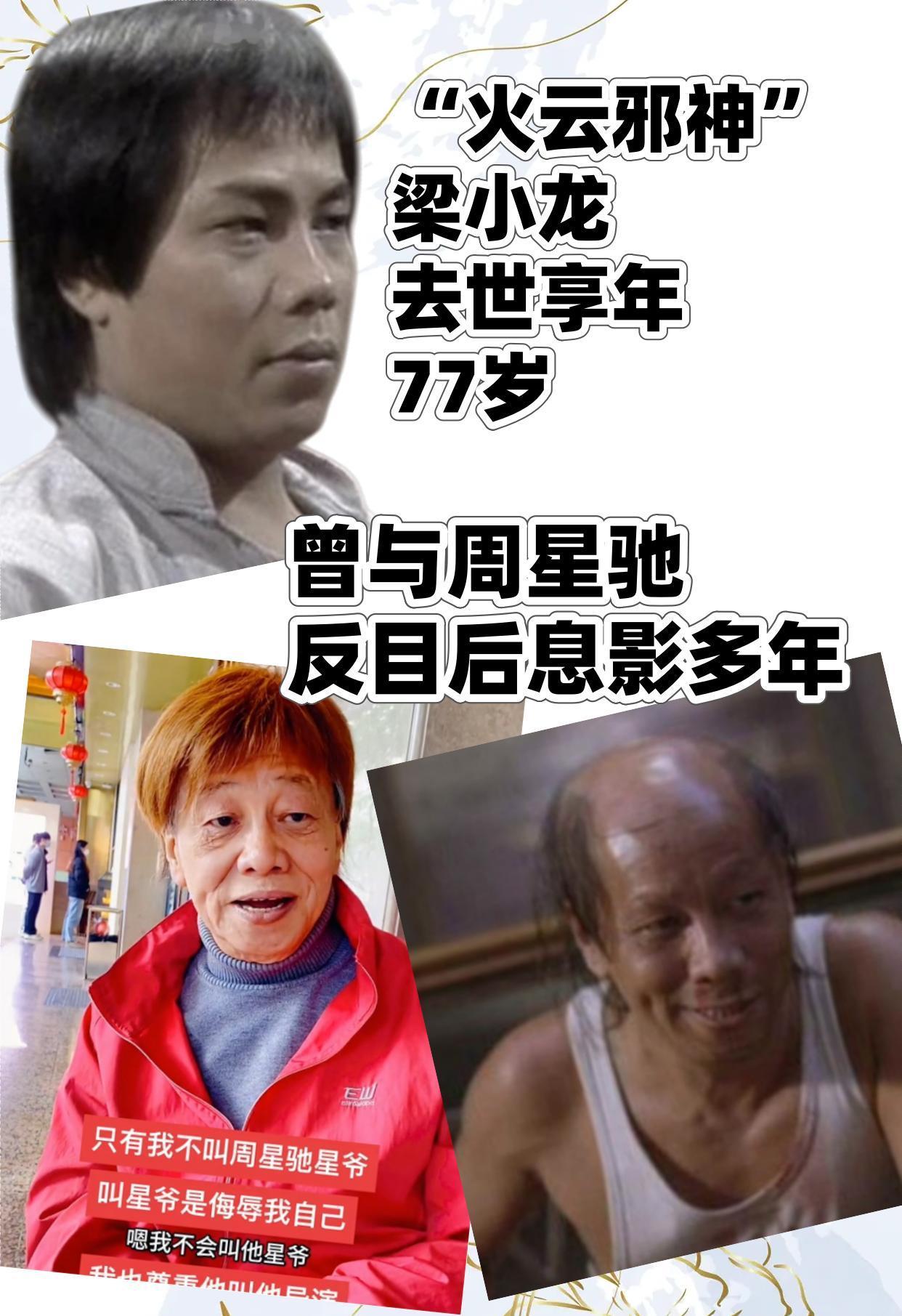 “火云邪神”梁小龙去世享年77岁,曾与周星驰反目后息影多年 就在今天下午,香港娱乐圈再次传来噩耗直指曾经在周星驰导演的经典喜剧片《功夫》里面饰演火云邪神一角的梁小龙已经在1月14日去世,享年77岁。 而讲到梁小龙,他凭借着1981年的《大侠霍元甲》里面的陈真一角走红,之后因为说错话被封杀息影二十年直到2004年才凭借着周星驰导演的《功夫》再次翻红,但想不到《功夫》拍完之后,梁小龙就同周星驰闹翻了,所以他干脆不再拍戏,近年来更加是深居简出,在去世前一日1月13日还和朋友聚会在深圳罗湖打羊肉火锅,但是不知道为什么打完火锅之后,梁小龙就去世了,据说他的出殡仪式暂定于1月26日在深圳龙岗举行啊! 最后只希望梁小龙一路走好。