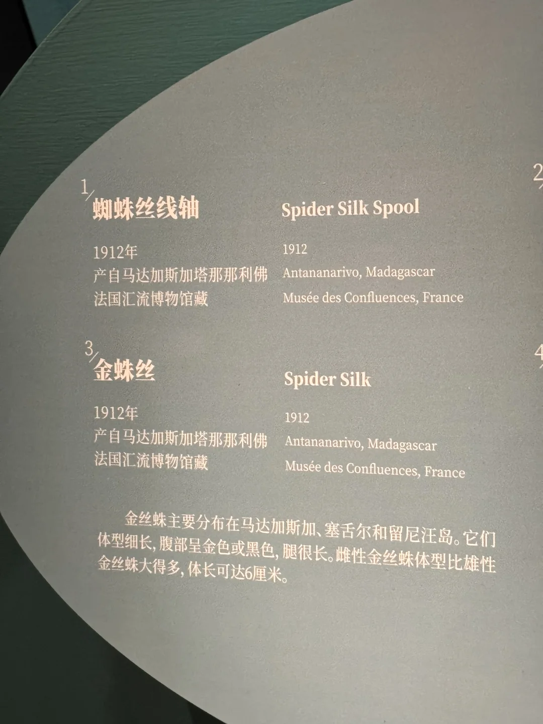 • 来源:金蛛丝主要由马达加斯加红腿金圆蛛等金蛛属蜘蛛分泌。这些蜘蛛通常生活在热带和亚热带地区,它们利用蛛丝来编织蜘蛛网,以捕捉猎物。